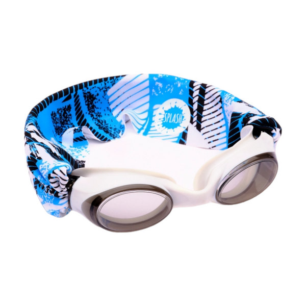 Our Boardwalk swim goggle features our tangle-free strap in a blue, white & black abstract palm print, paired with a white frame and lightly tinted gray lenses.