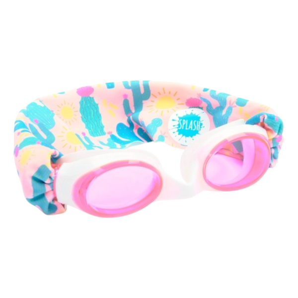 Our Desert Sunshine swim goggle features our tangle-free strap in a flowering cactus print and pink background, paired with a white frame and lightly tinted pink lenses.