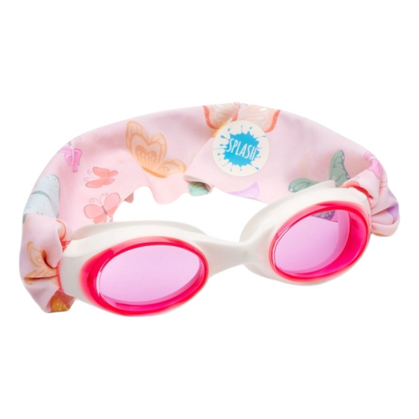 Our Flutter swim goggle features our tangle-free strap in an array of pretty butterflies on light pink and peach background, paired with a white frame and lightly tinted pink lenses.