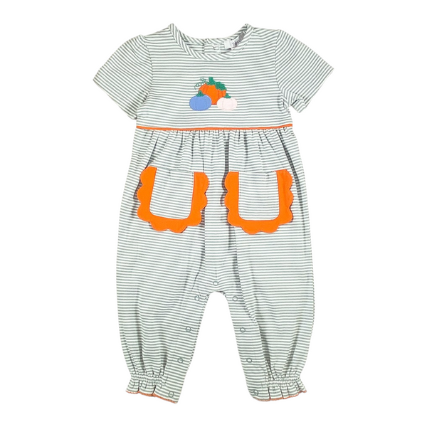 Made from soft, breathable fabric, the "Pumpkin Applique Girl's Romper" ensures comfort throughout the day, whether it's for indoor play, a stroller ride, or a family gathering. The convenient snap closures make dressing and diaper changes swift and hassle-free, keeping both mom and baby happy.