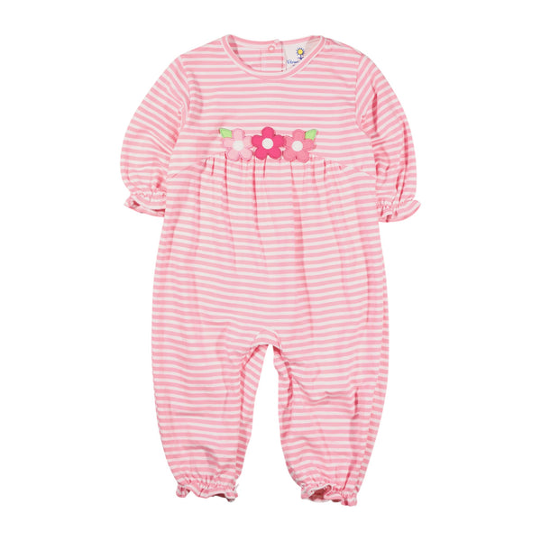 A sweet gift that’s as practical as it is charming, this longall is crafted in pink and white yarn-dyed stripe interlock knit. Appliqué flowers in multiple shades of pink bloom across the front yoke and back seat, adding a playful detail to this classic silhouette.
