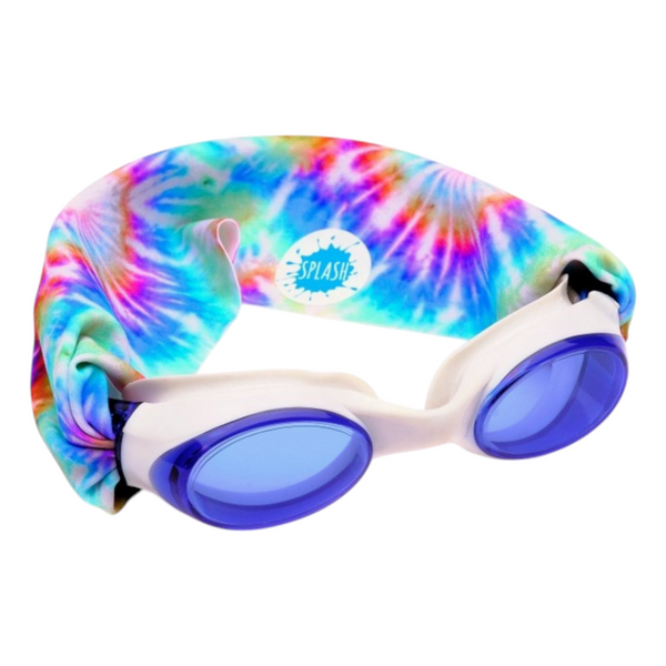 Our Tie Dye swim goggle features our tangle-free, patent-pending strap in tie dye print, paired with a white frame and lightly tinted blue lenses.