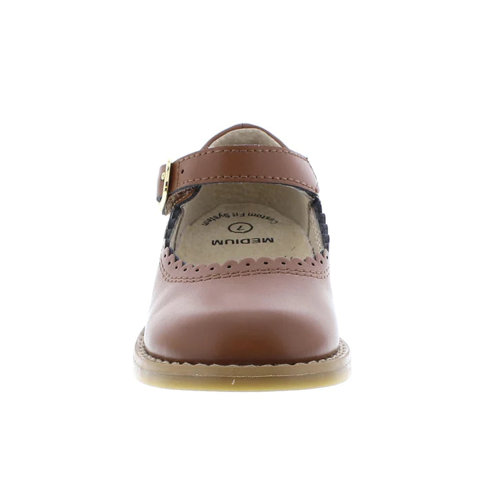 This classic leather mary jane features a hook-and-loop ankle strap with decorative buckle and scallop/ perf throat design. It's the perfect mary jane for casual and dressy occasions.