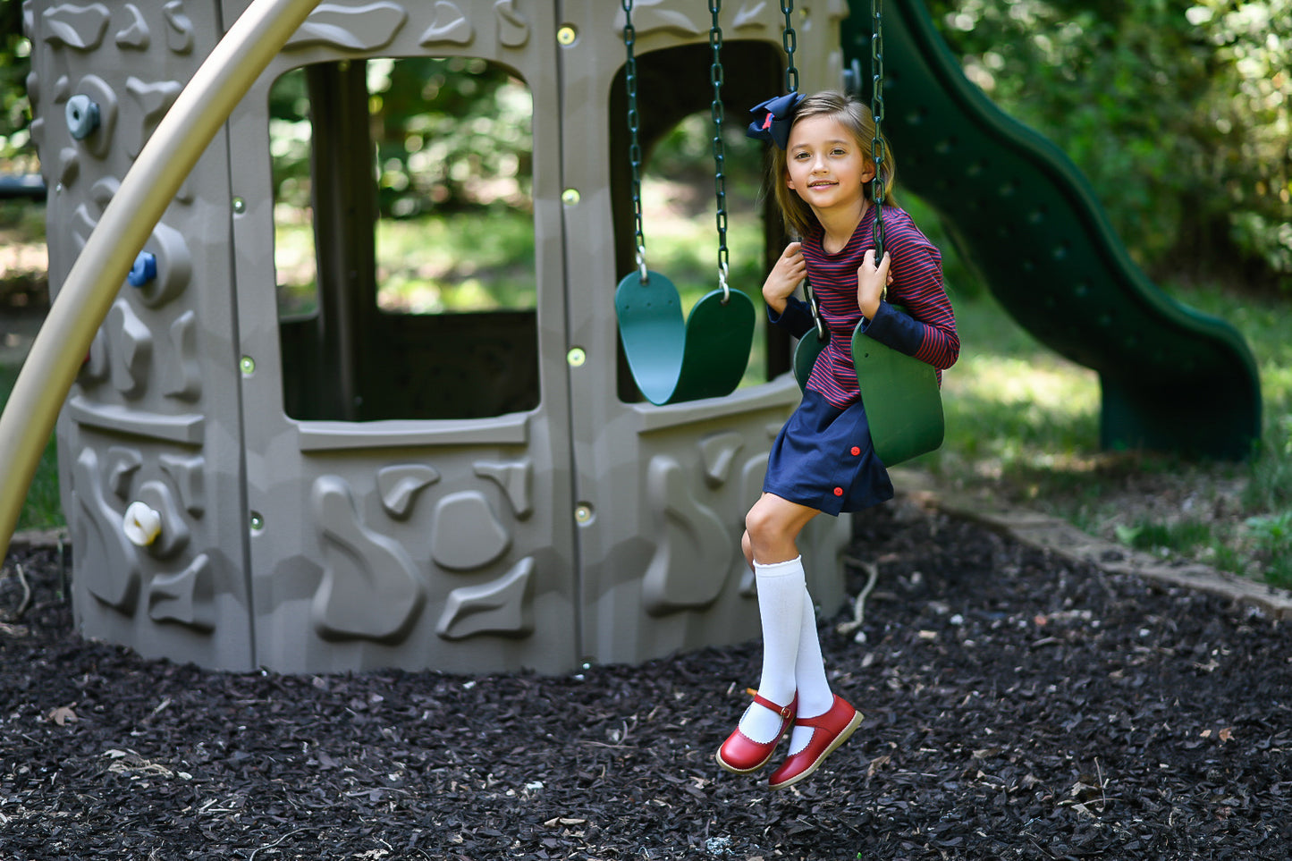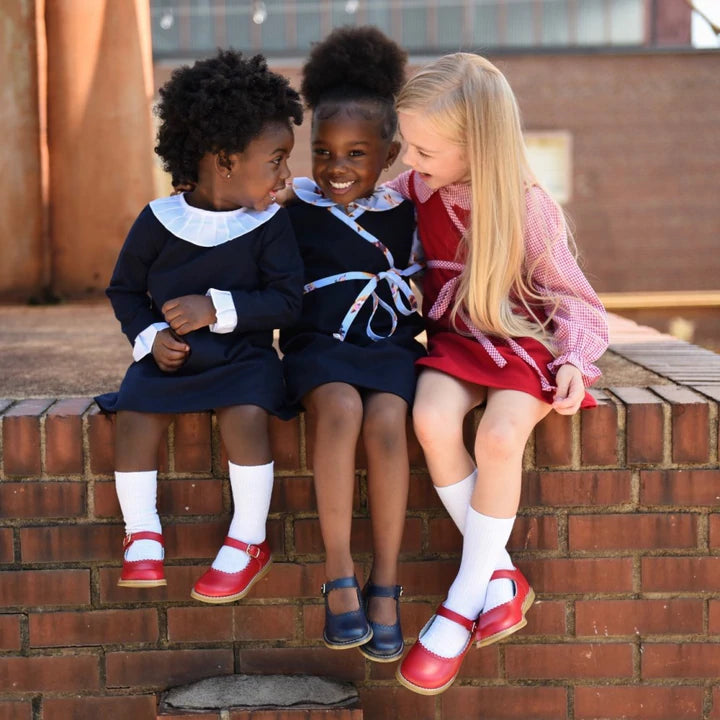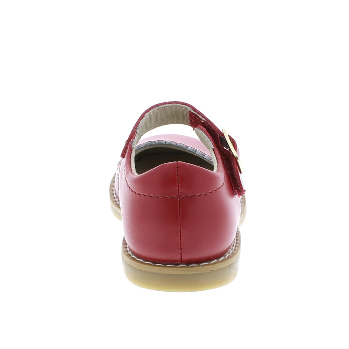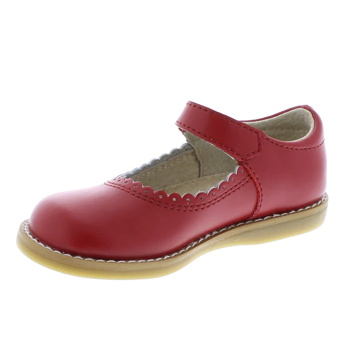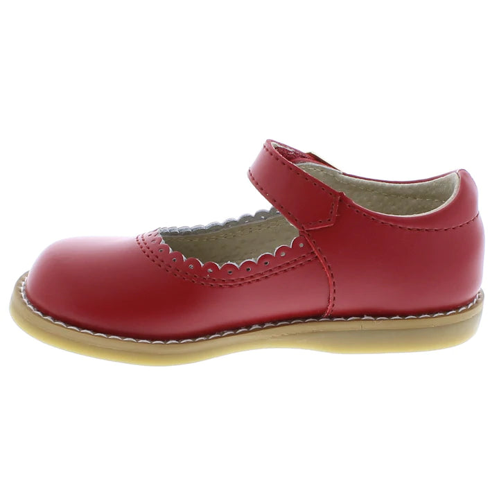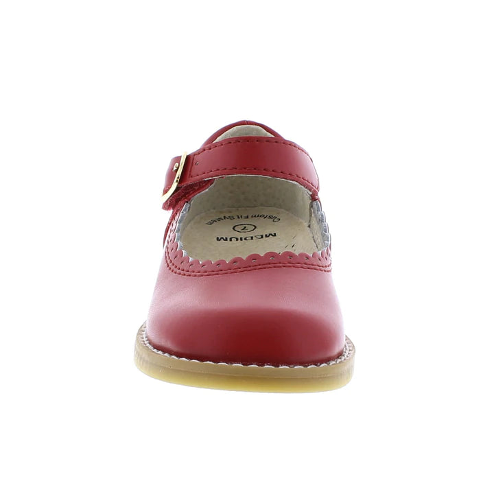 This classic leather mary jane features a hook-and-loop ankle strap with decorative buckle and scallop/ perf throat design. It's the perfect mary jane for casual and dressy occasions.