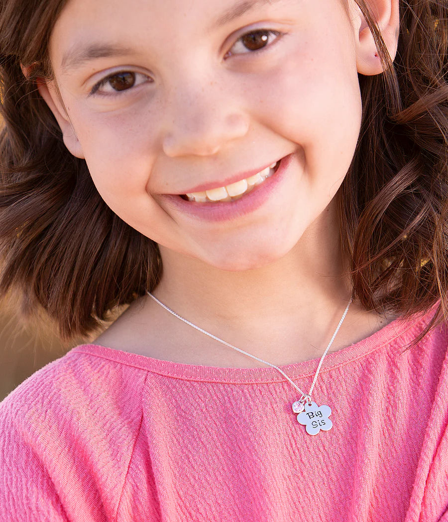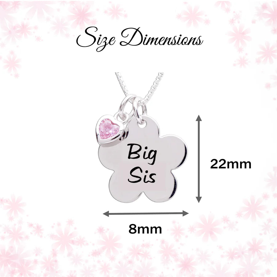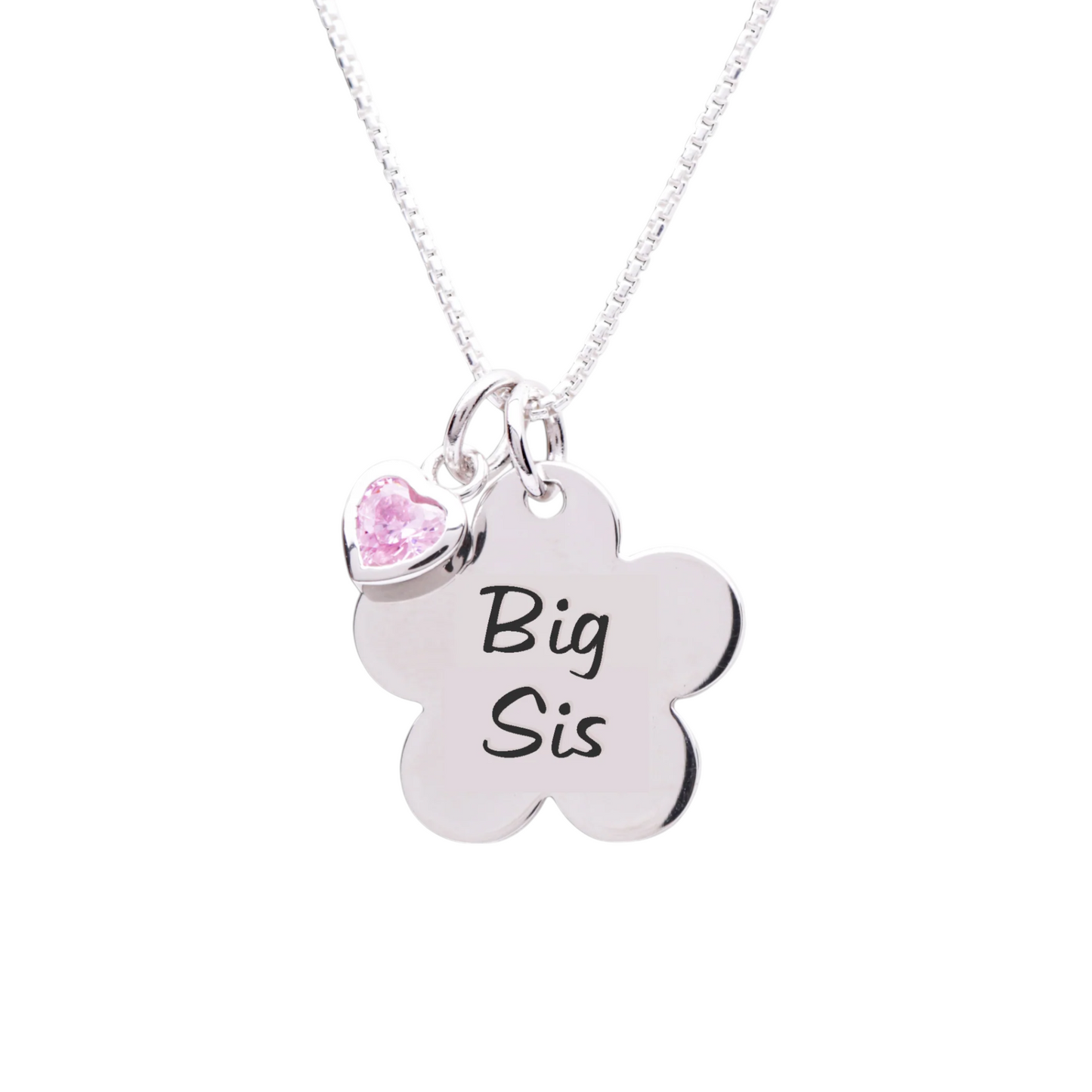 Adorable Sterling Silver "Big Sis" daisy flower charm necklace with pink sparkling heart accent on a 14" Italian Chain. What a special gift for new Big Sisters! Matching Lil Sis Necklace also available for her little sister. Necklace comes in beautiful gift box that kids love.