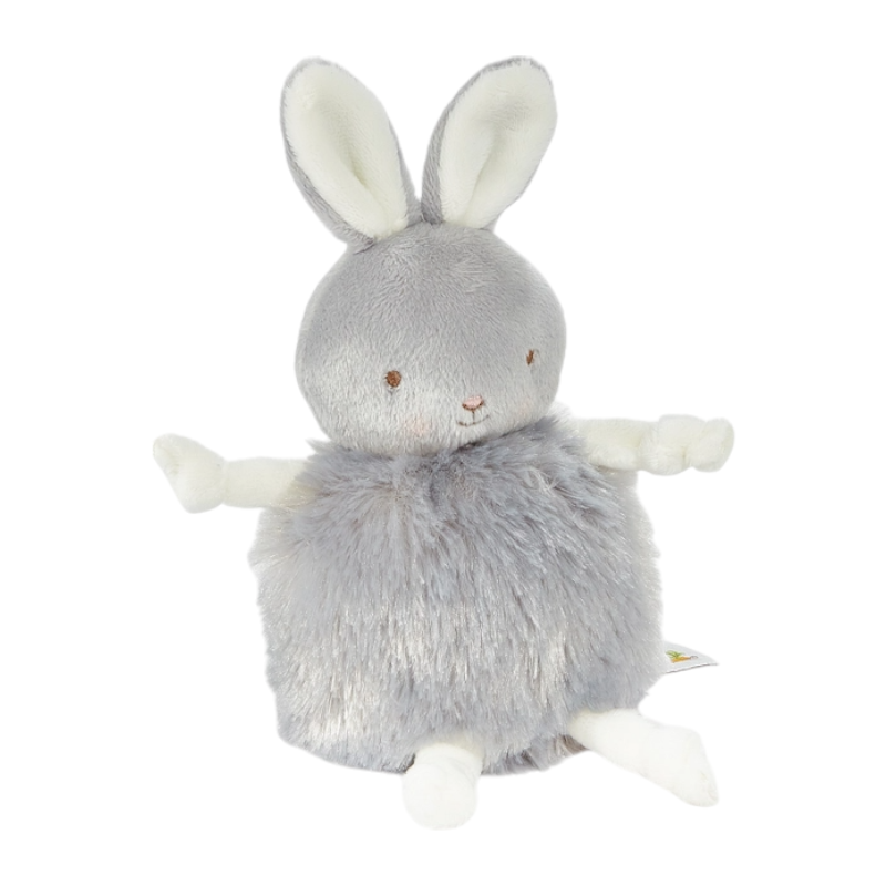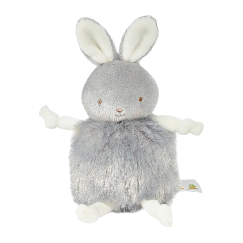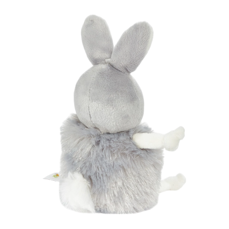 Our teeniest new friends happily fit in the tiniest hands. This is a fluffy round gray furred stuffed bunny with velour face and dangly arms and legs. Features an embroidered face and our signature blushed cheeks.