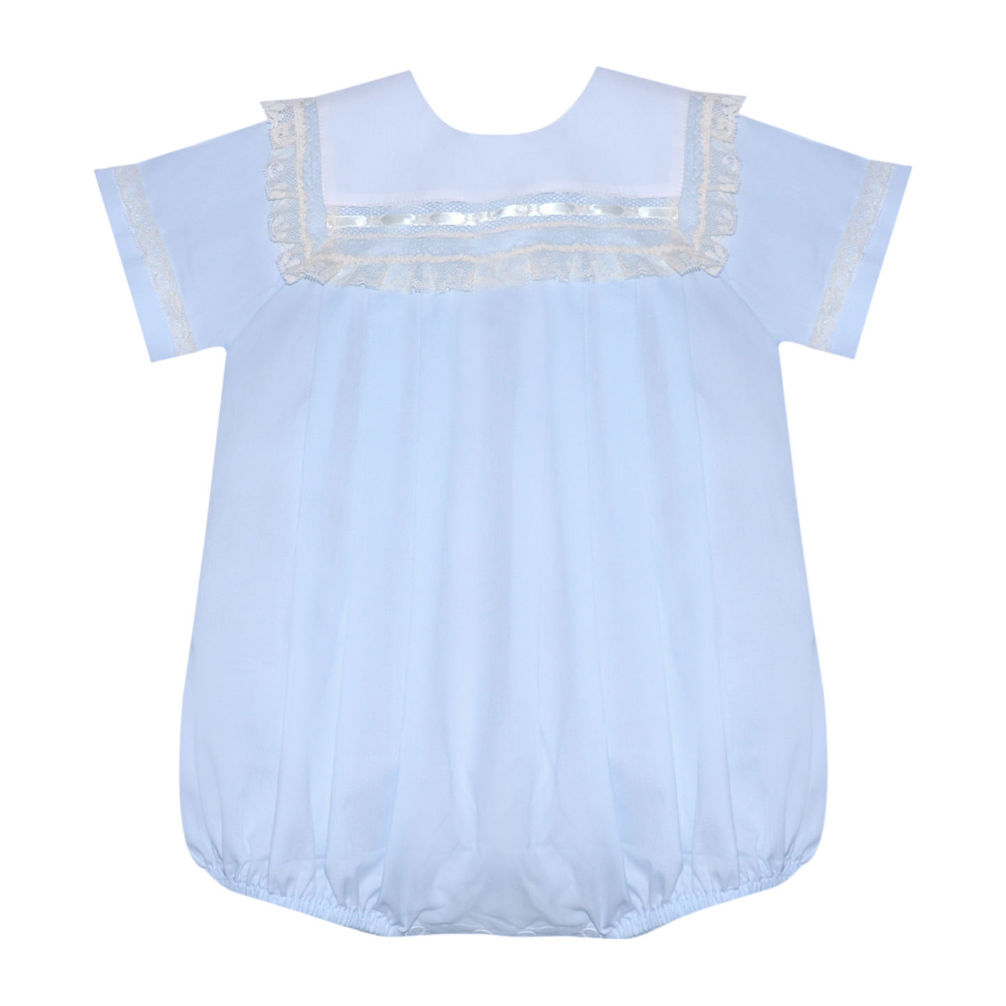 This handsome bubble in classic blue features vintage styling and Victorian lace trim.