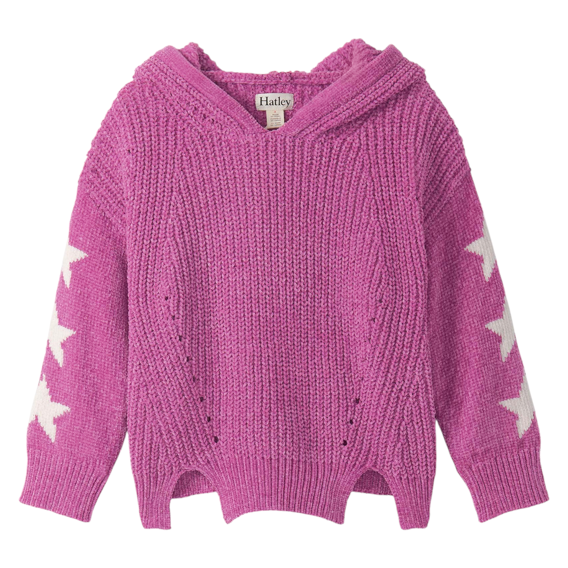 Cozy meets playful in the Girls Radiant Orchid Chenille Pullover Sweater, crafted from ultra-soft chenille yarn for a plush feel she’ll love. This relaxed-fit sweater comes in a rich purple hue with a chunky ribbed knit pattern, finished with tighter ribbing at the cuffs and hem for structure. Bold white star motifs line both sleeves, adding a fun, standout detail. The scalloped hem features small notched slits at the front and back, giving the silhouette a modern twist while ensuring ease of movement.