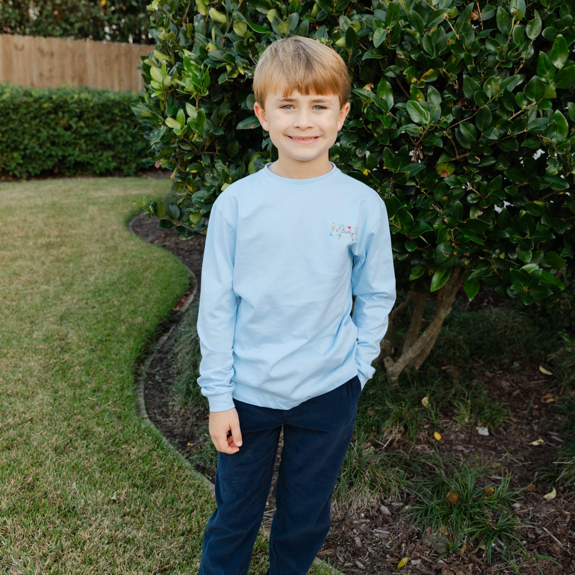 Your handsome boy will be ready for the festive season in this heathered long-sleeve tee. Perfect to keep them warm, the subtle Christmas trio of Labradors print on the back adds a whimsical touch to their seasonal wardrobe.