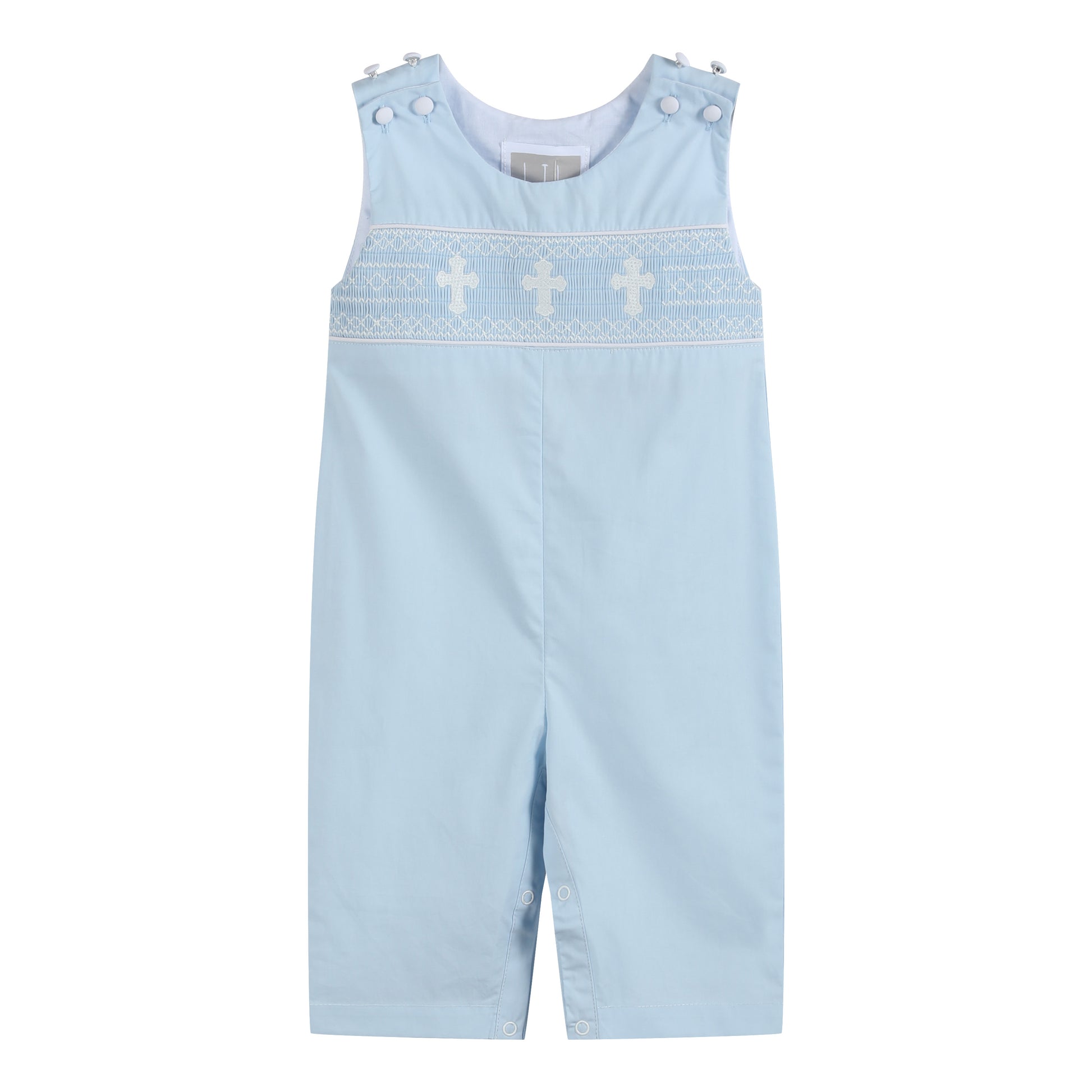 Perfect for Easter or church, these Light Blue Crosses Smocked Overalls feature delicate smocking with embroidered blue crosses on the front. Crafted in a serene light blue, the outfit not only exudes sweetness but also offers practicality with snaps at the crotch for easy diaper changes and adjustable sizing buttons at the shoulder. Elevate your baby boy's style for special occasions with this timeless and adorable ensemble.