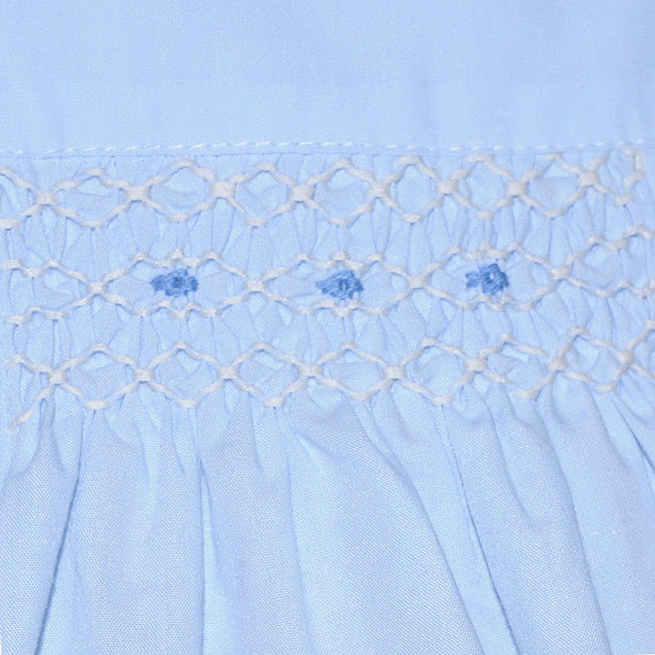 The Dallas’ traditional appeal is accentuated with hand embroidered smocking, pleating down the bodice, and iridescent buttons on the shoulder. This piece is perfect for any occasion. Pair with Dallas Boy Bubble, Dallas Blue Short Set, Dallas Pink Bloomer Set, Dallas Pink Dress, Dallas Blue Daygown, Dallas Pink Bubble or Dallas Pink Daygown for a sibling set.