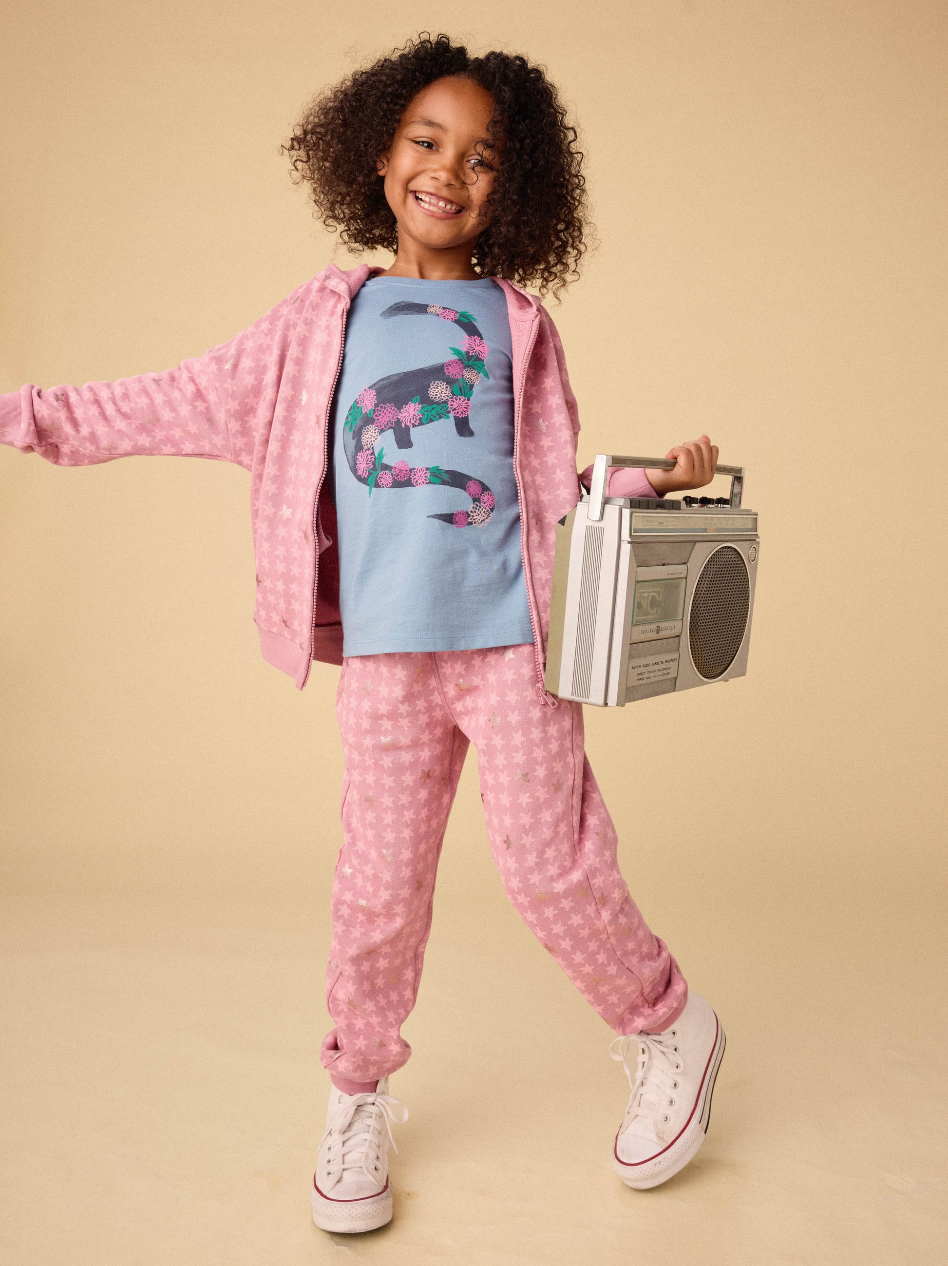 We gave this gentle giant a soft side--decked out in a blooming bouquet of pink and purple florals. It's a sweet twist on dino love that'll charm any prehistoric fan.