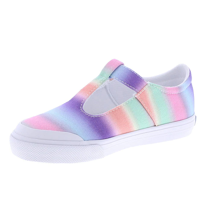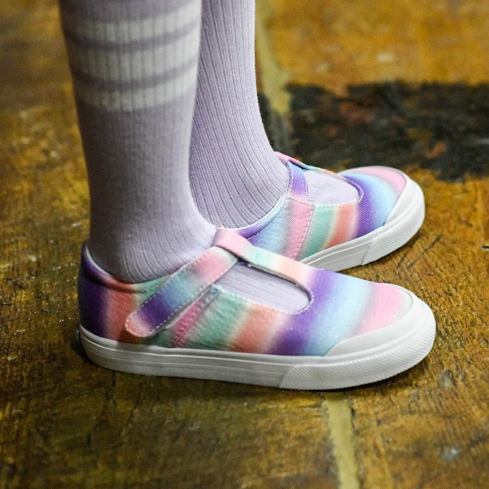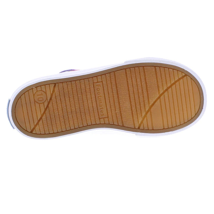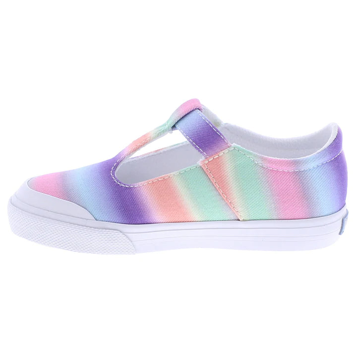 This textile t-bar mary jane sneaker features hook-and-loop closure.