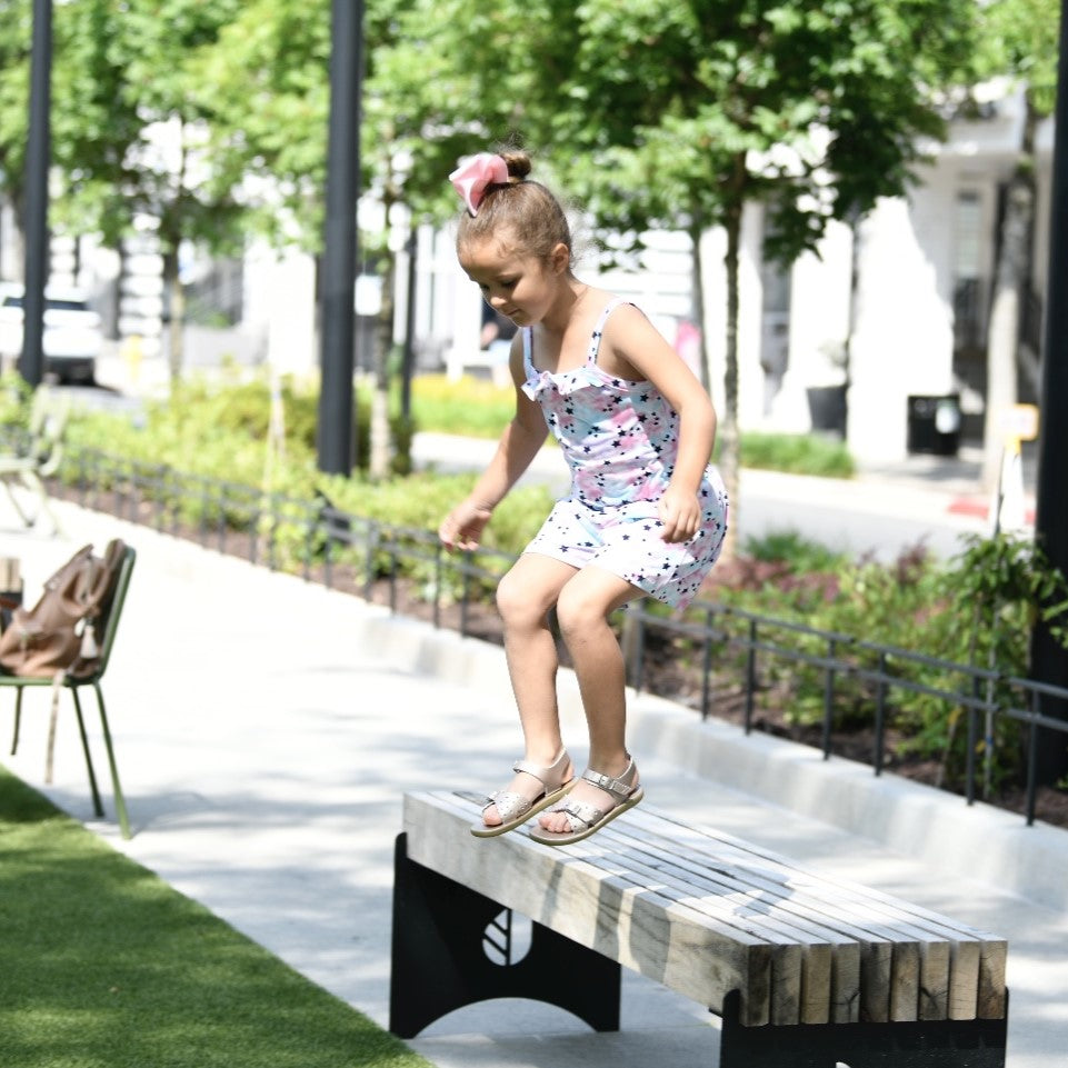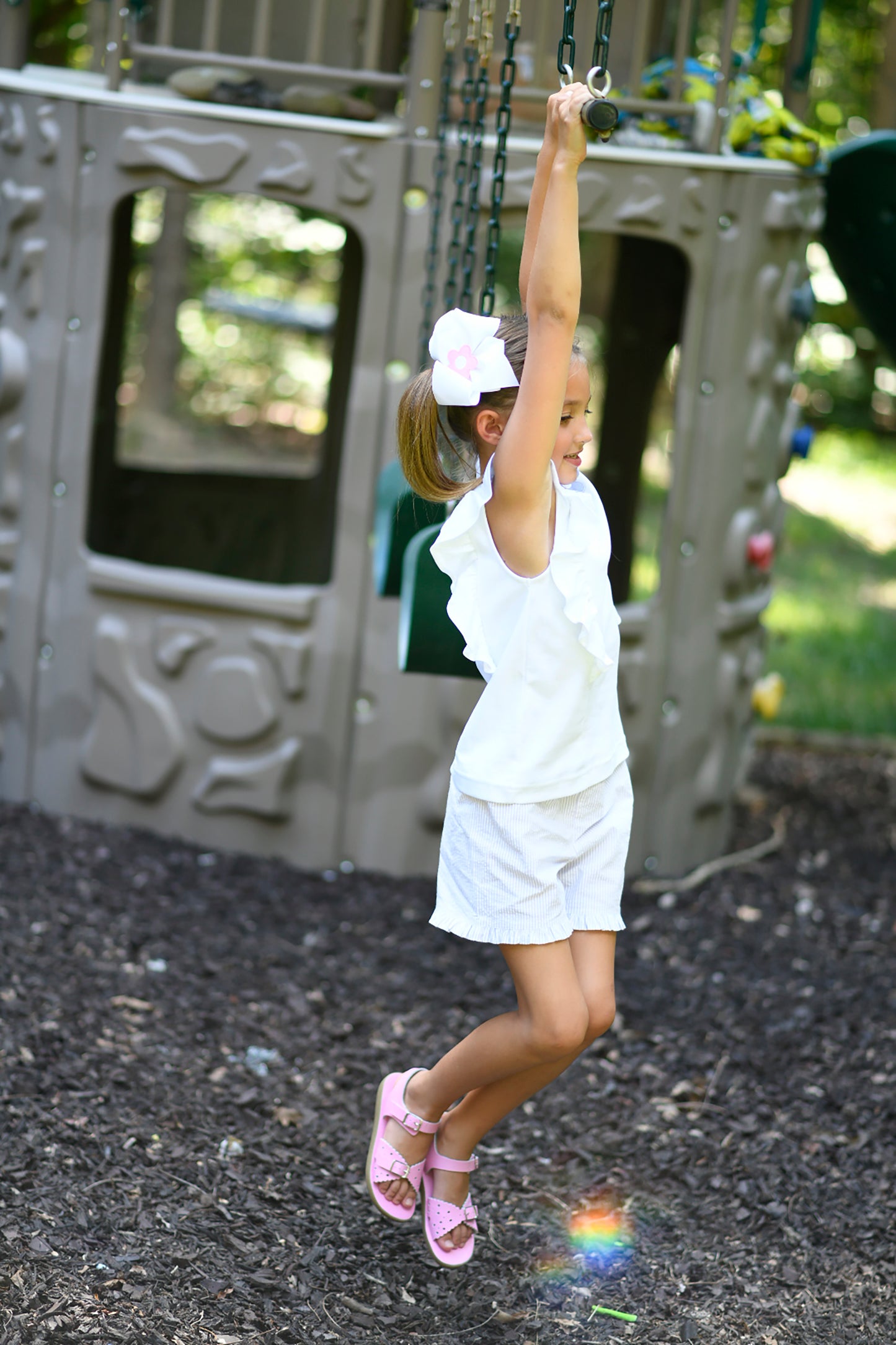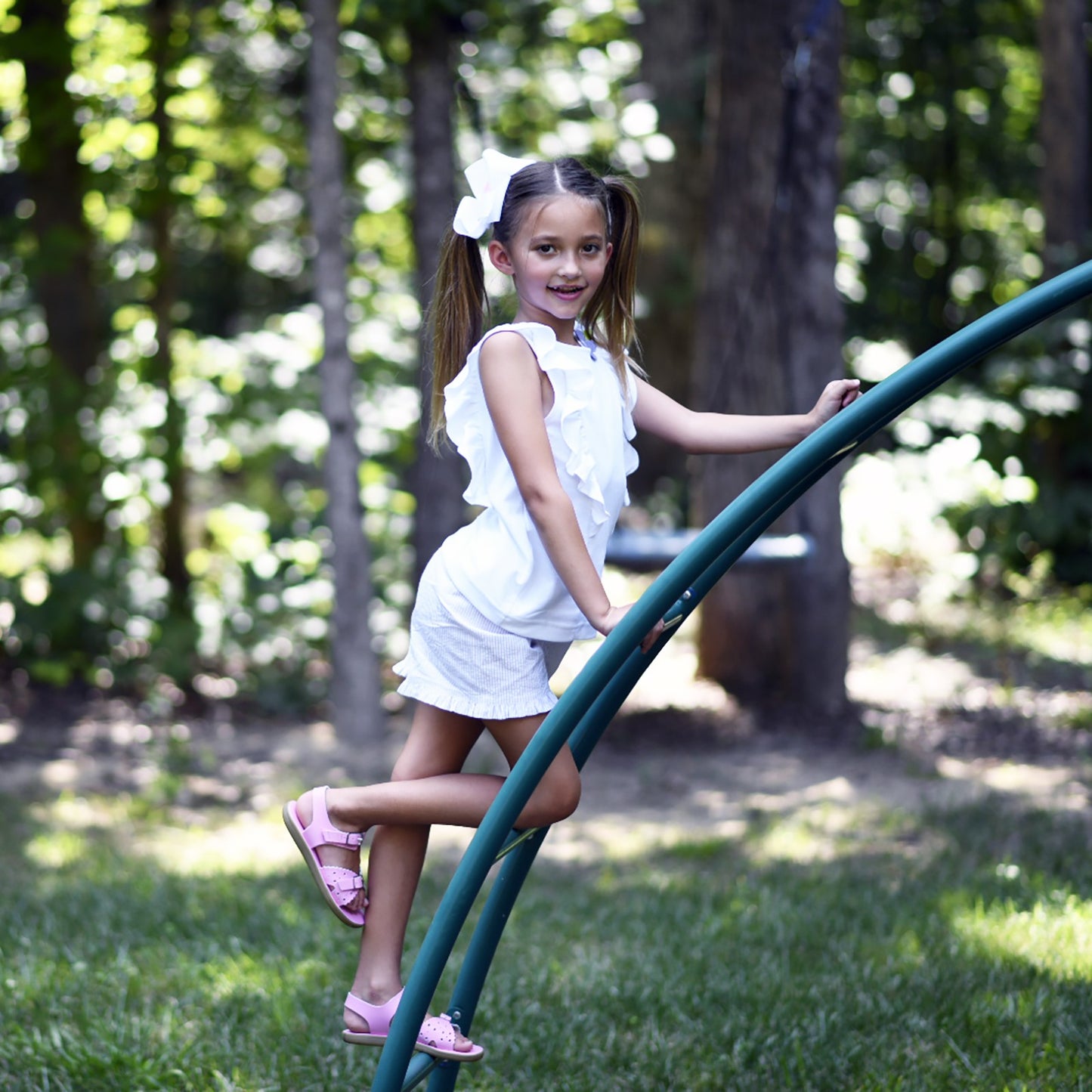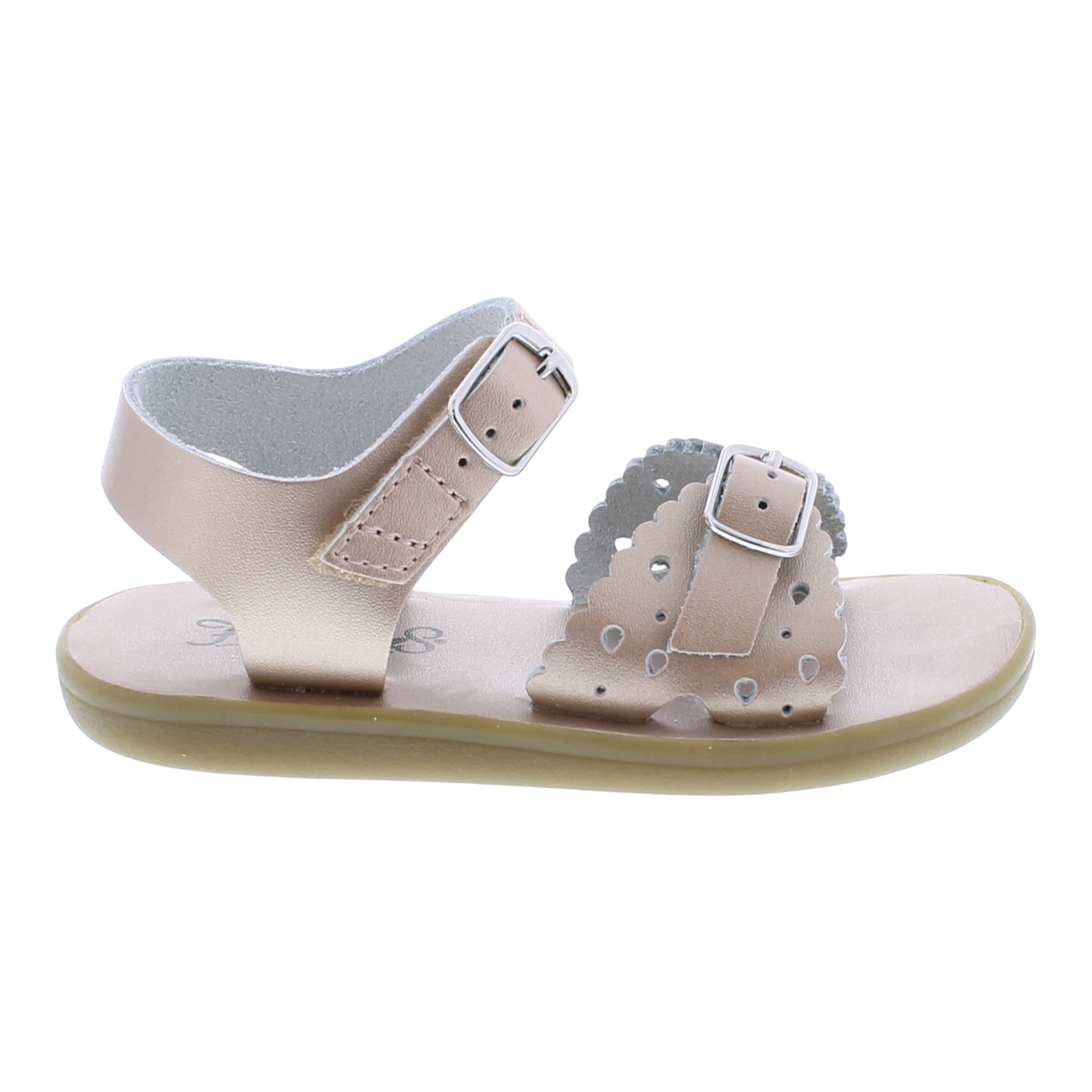 The Ariel is an open toe, open heel microfiber sandal featuring true-buckle forefoot strap with decorative tear-drop perf design and hook-and-loop ankle strap with a decorative buckle.