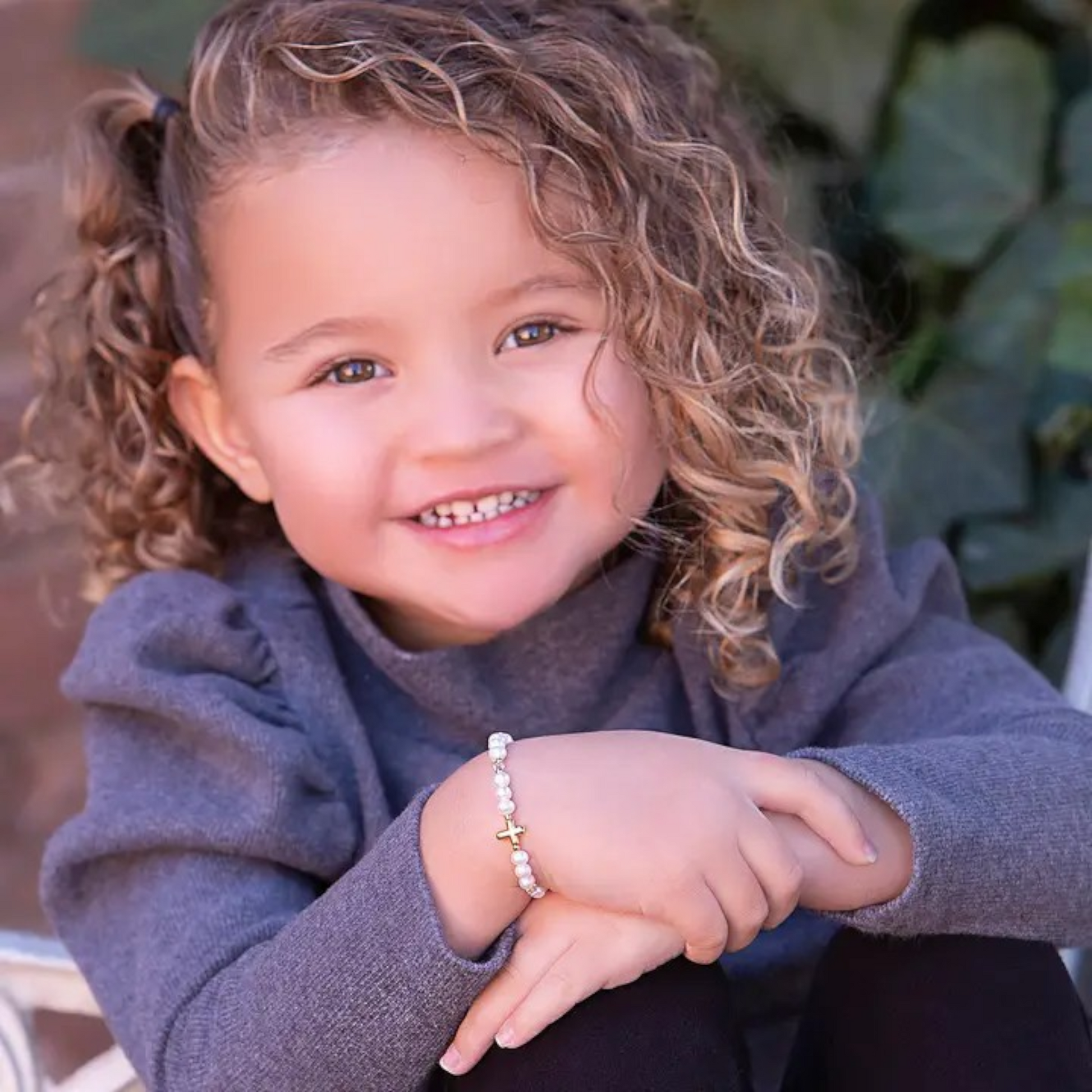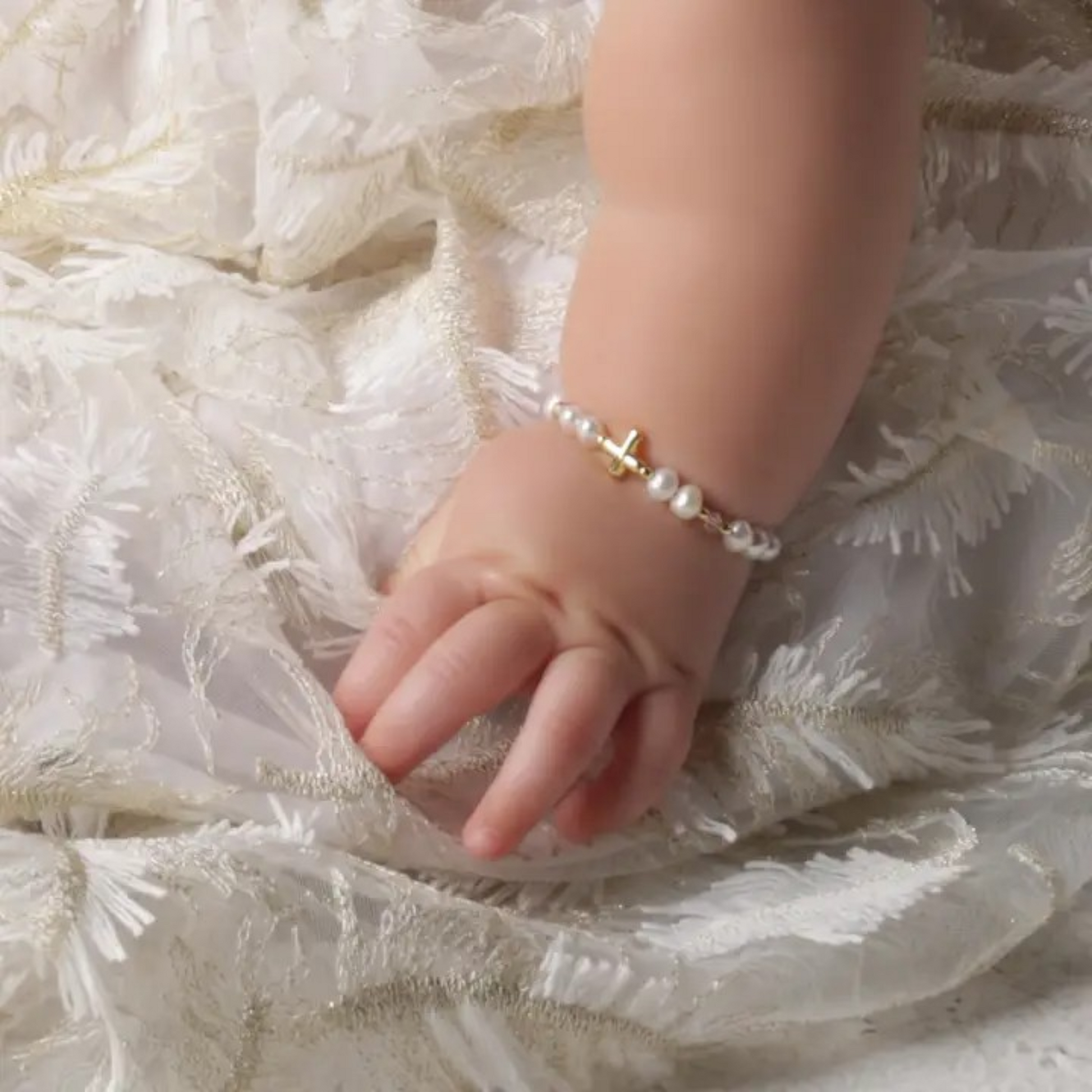 This keepsake bracelet is hand-made in the USA with high-end Austrian simulated pearls and 14K Gold-plated beads accented with a dainty cross embellished in the center! This is a high quality bracelet made with sterling silver and plated in 14K gold with high-end crystals. This makes a very special baptism gift, infant dedication gift, or First Communion Keepsake for girls. Each bracelet has an extension chain, as the child grows just move to the next link for a perfect fit. This jewelry is available in three sizes and is great for infants, babies, toddlers, and older girls. This cross bracelet comes in a beautiful gift box and is hand-made in the USA. A keepsake she will cherish Forever!
