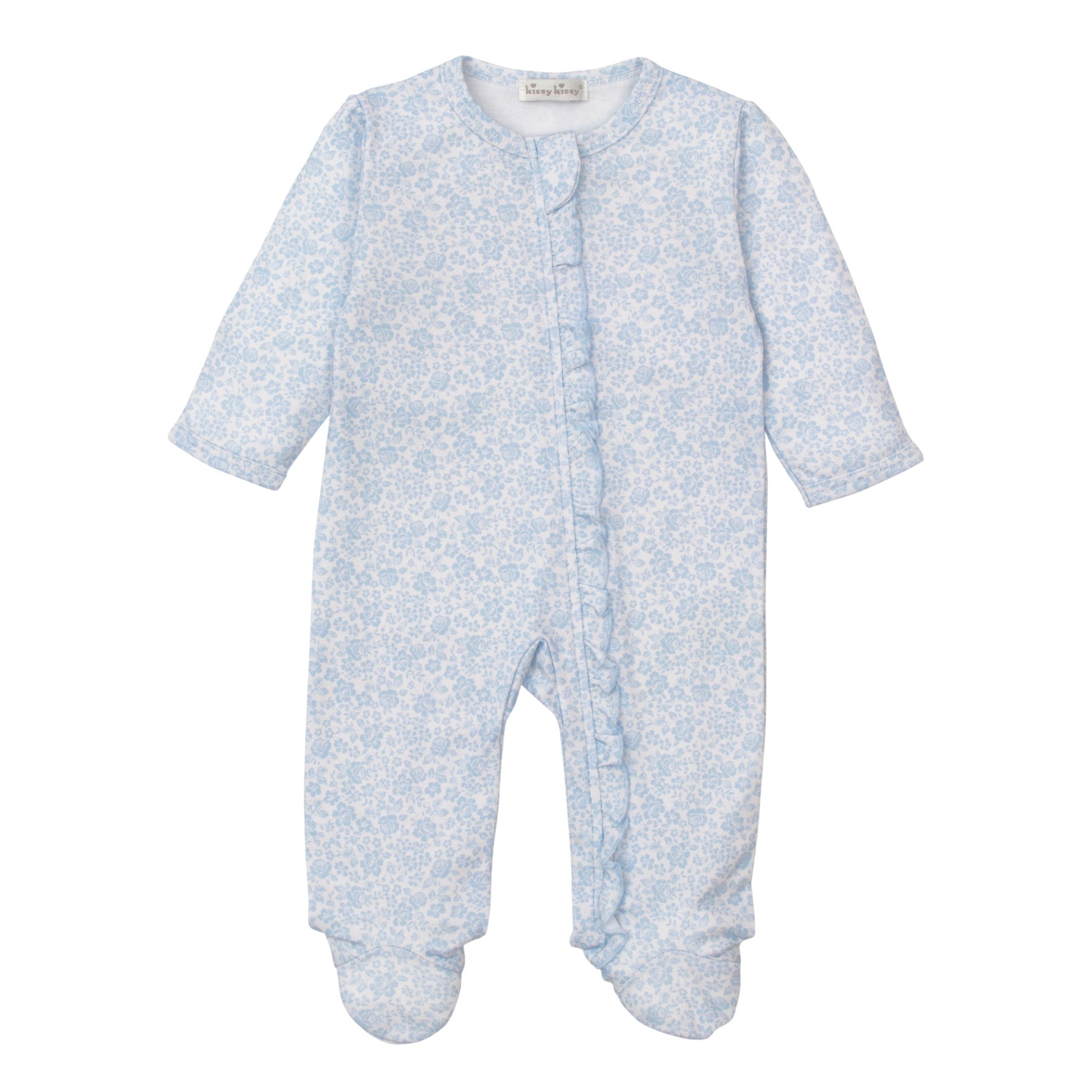 Playfully patterned, our cozy, blue old english roses print zippered footie for your baby is made from the softest Pima cotton for ultimate comfort.