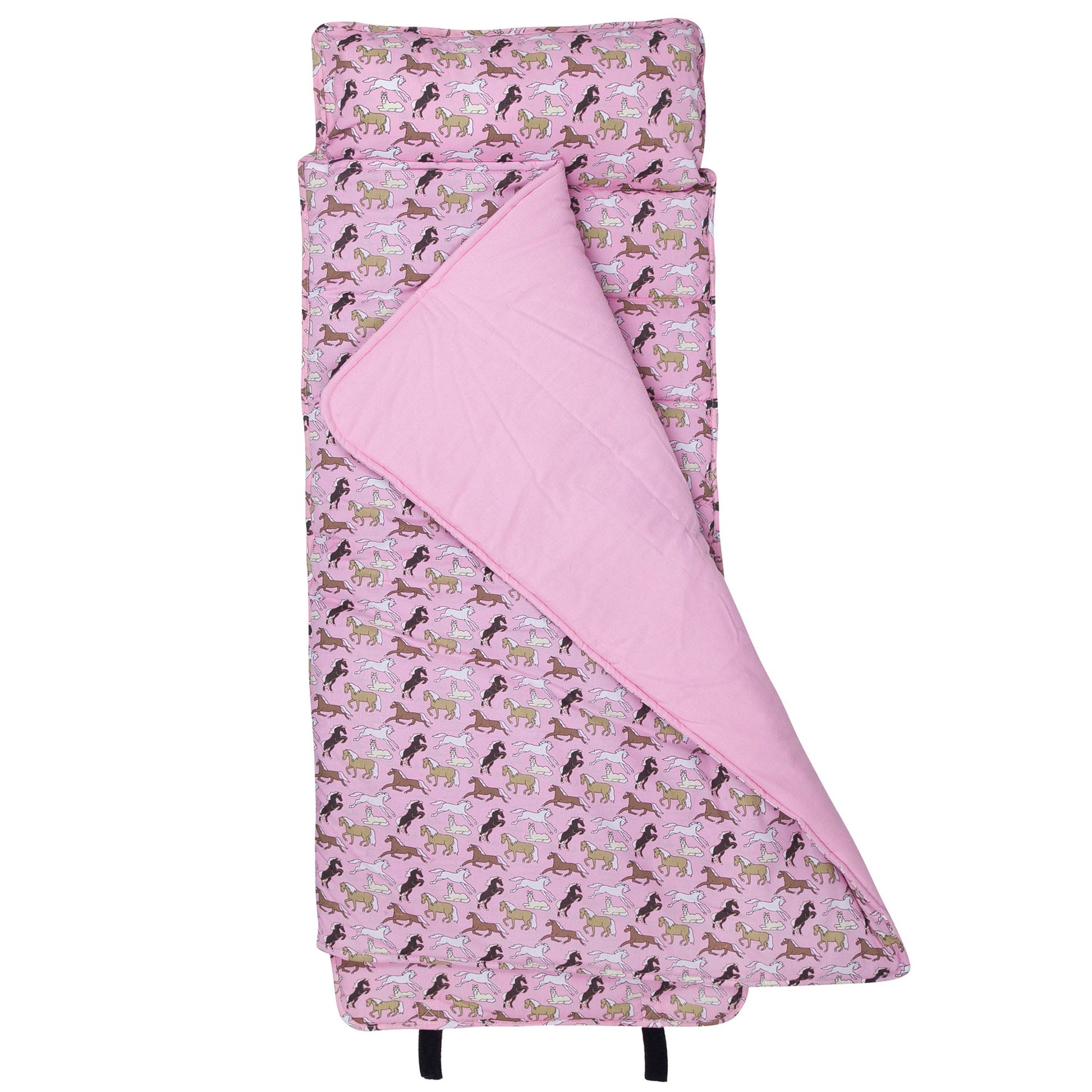 Wildkin's Horses in Pink Original Nap Mat is a customer favorite! Drifting off to sleep during nap time is a breeze when your child is snuggled up in Wildkin’s Original Nap Mat. Wildkin’s Original Nap Mat is made from cotton and polyester materials. The attached comforter style blanket and built in removable pillow keep your little one extra warm and cozy. Each Nap Mat rolls up for convenient travel and storage, complete with easy hook and loop closure and carrying handle. Its travel-friendly design makes it easy for your little one to take their Nap Mat to-and-from school, sleepovers, and more. Machine washable. L: 50" L x 20" W (Attached blanket measures 30" wide). Perfect for daycare and preschool nap time.