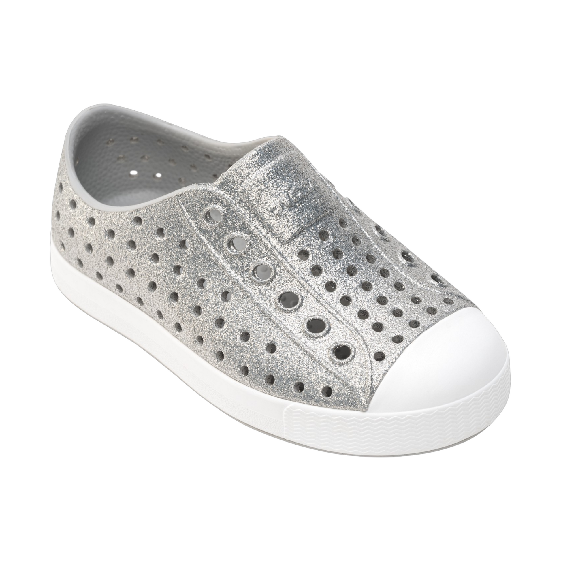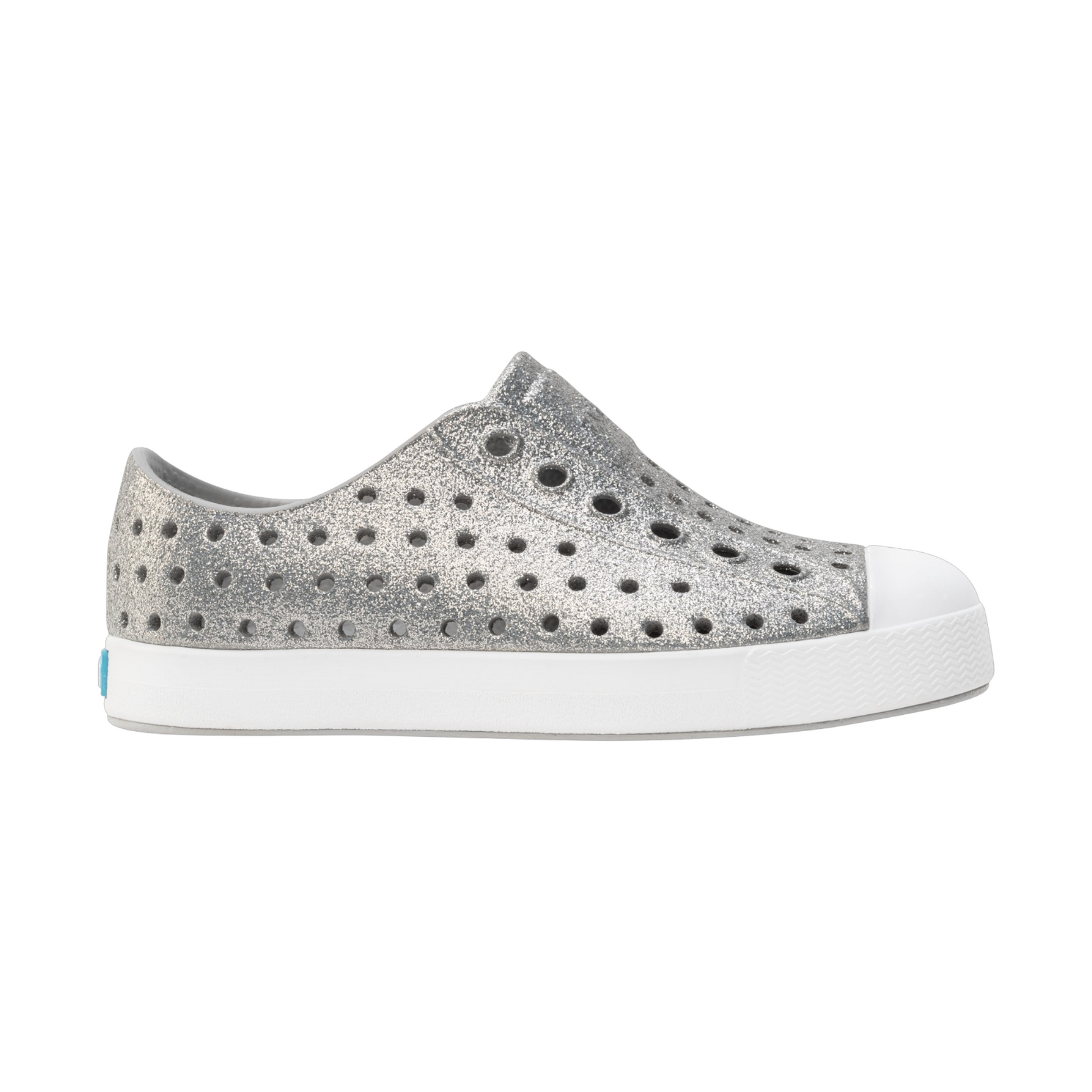 It's the leader of lite-ness and our original EVA all-star, the uncompromisable Jefferson. Like any reigning ruler of the ring, the Jefferson encompasses all of the fine features that you'd expect from a Native shoe. The brand new Bio Bling finish is made with a bio-based alternative to traditional glitter, derived from cellulose - a natural fiber derived from plants