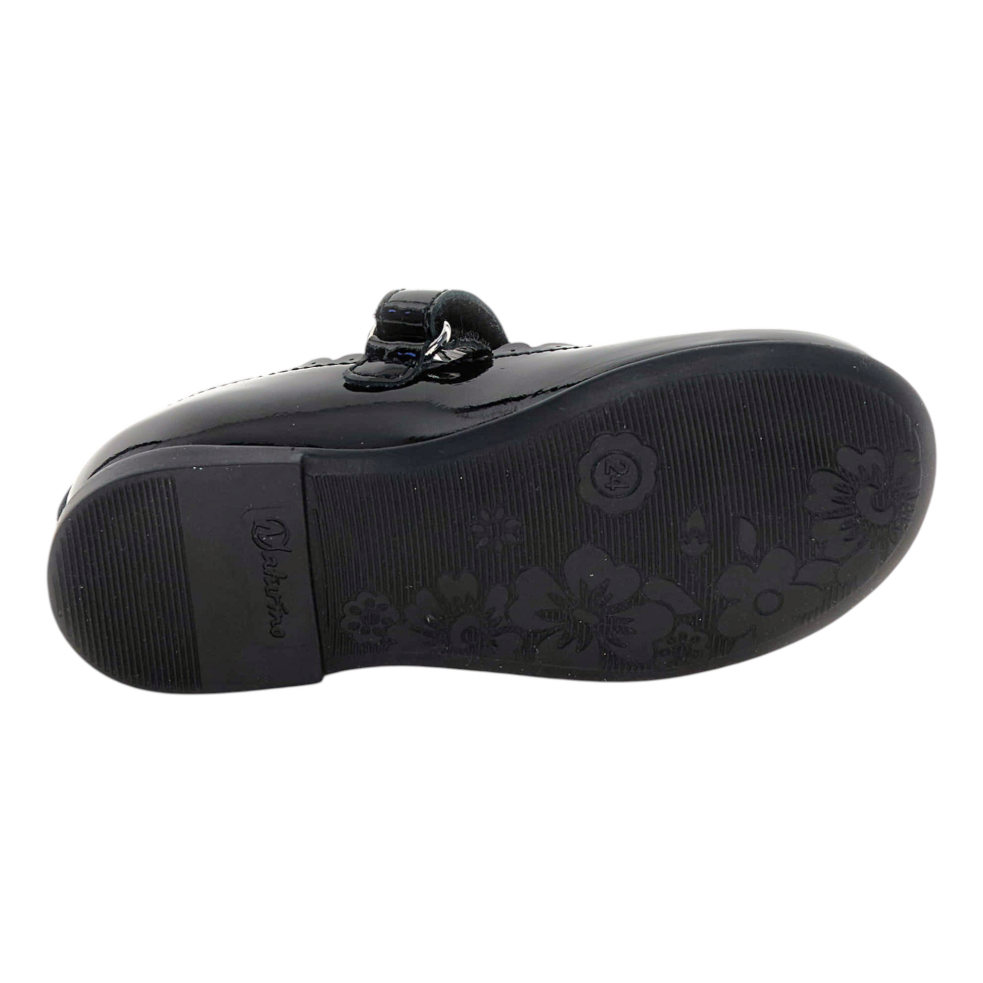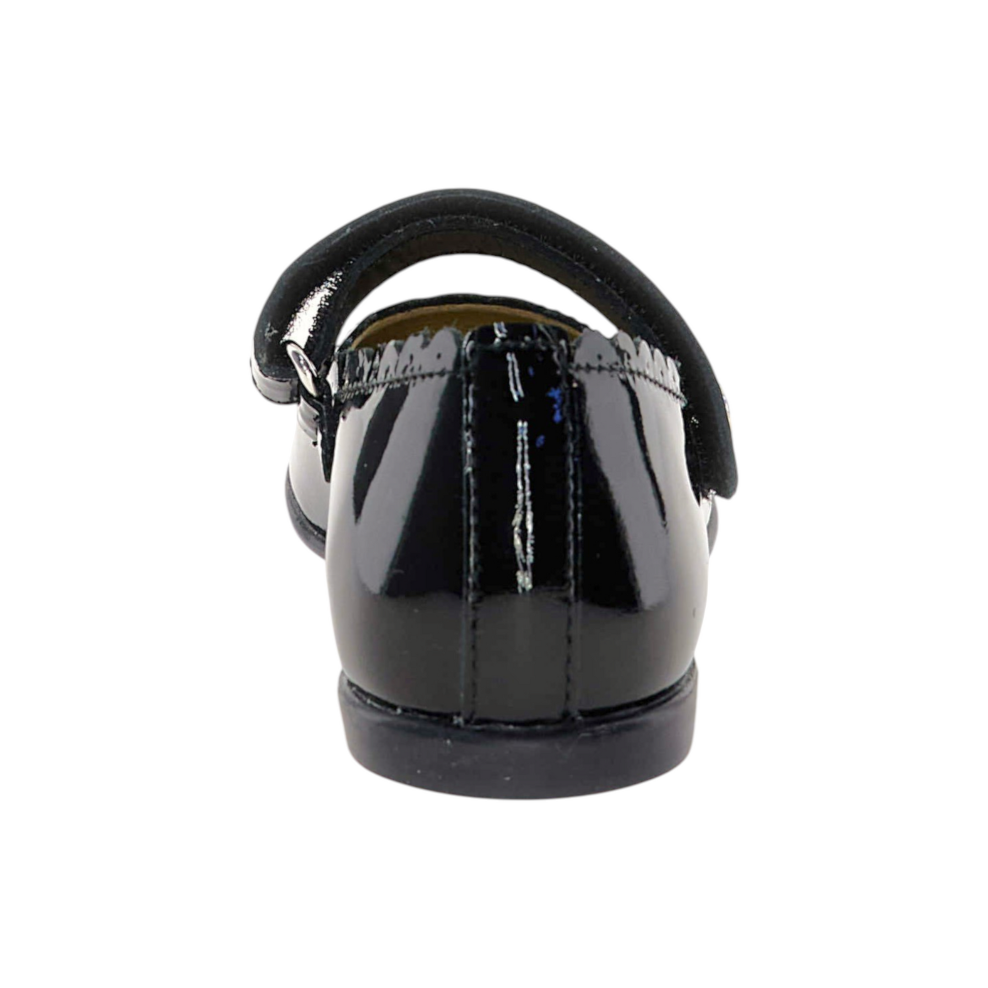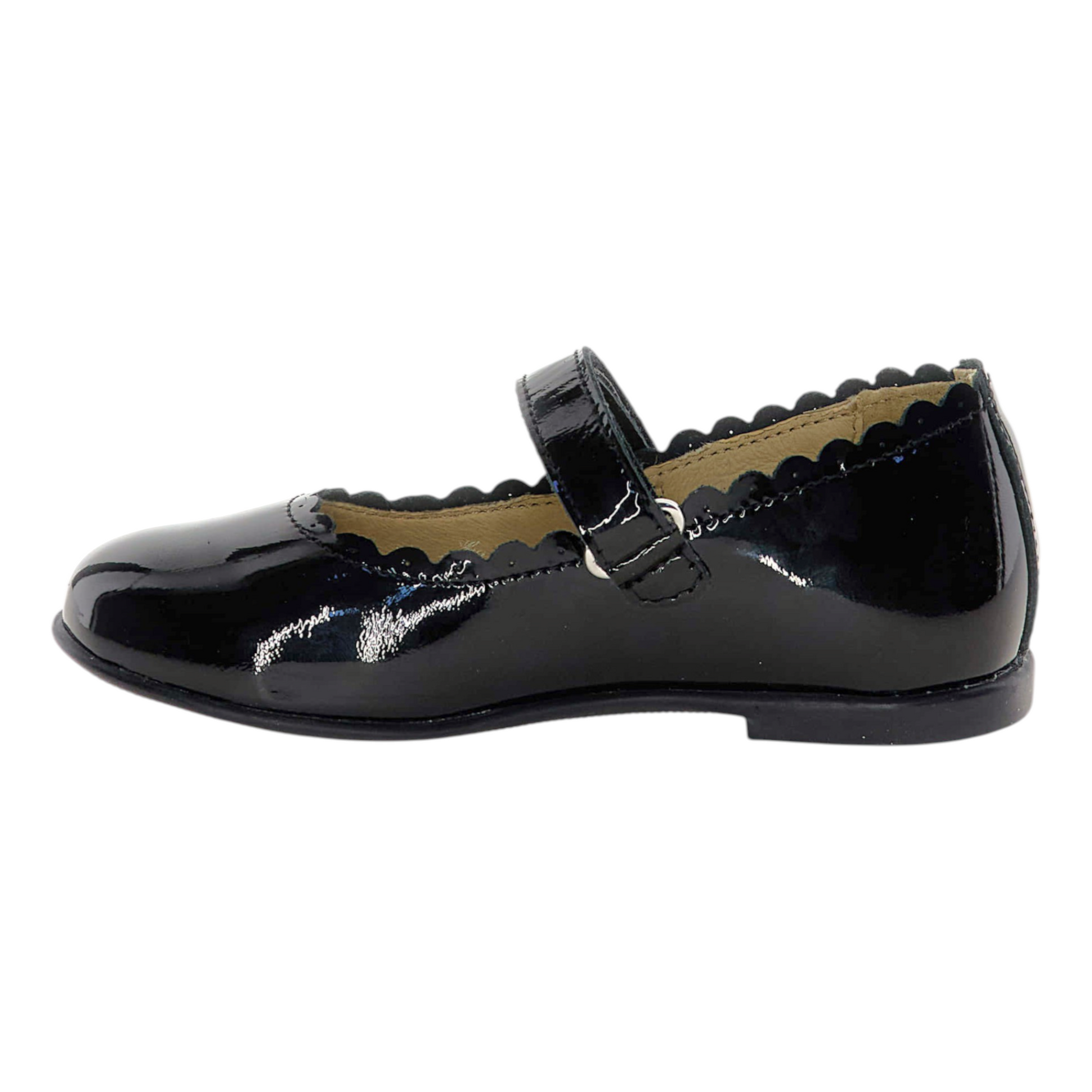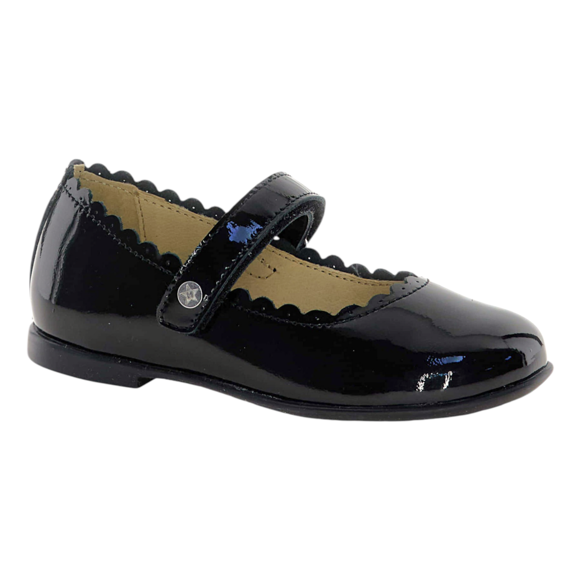 Mary Jane ballet flat with soft calfskin upper. The model features a scalloped edge, strap with metal star, leather lining and insole. Thin rubber sole.