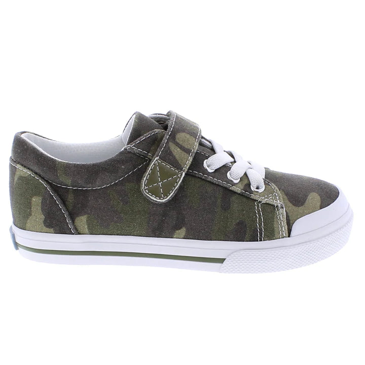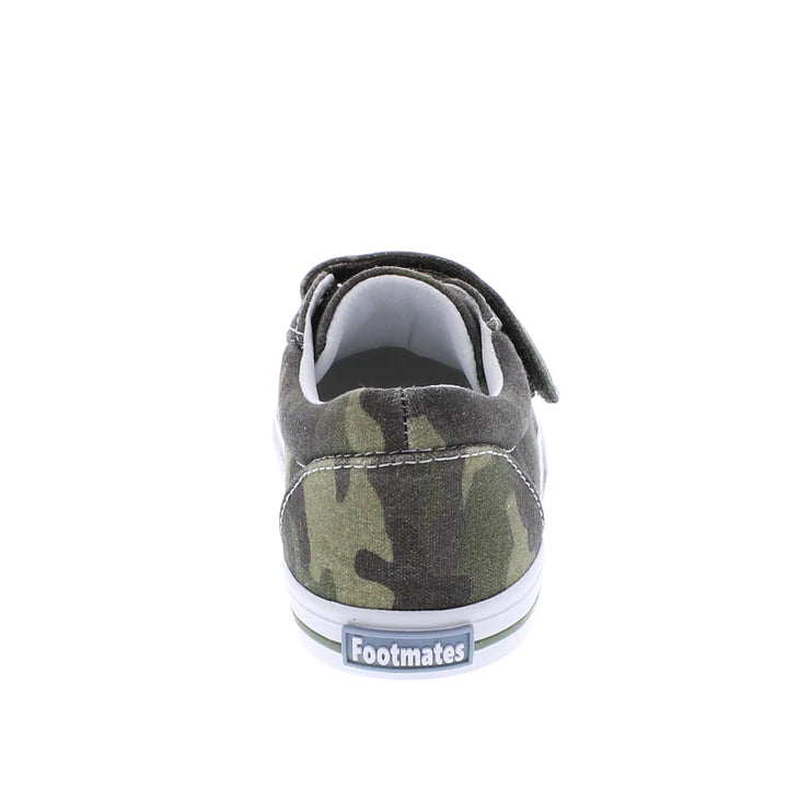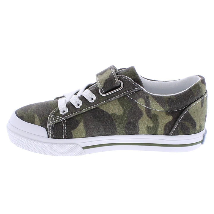 This textile blucher oxford vulcanized sneaker features hook-and-loop closure and decorative elasticized false- laces.. It has a non-skid sole and removable insole to fit wide feet.
