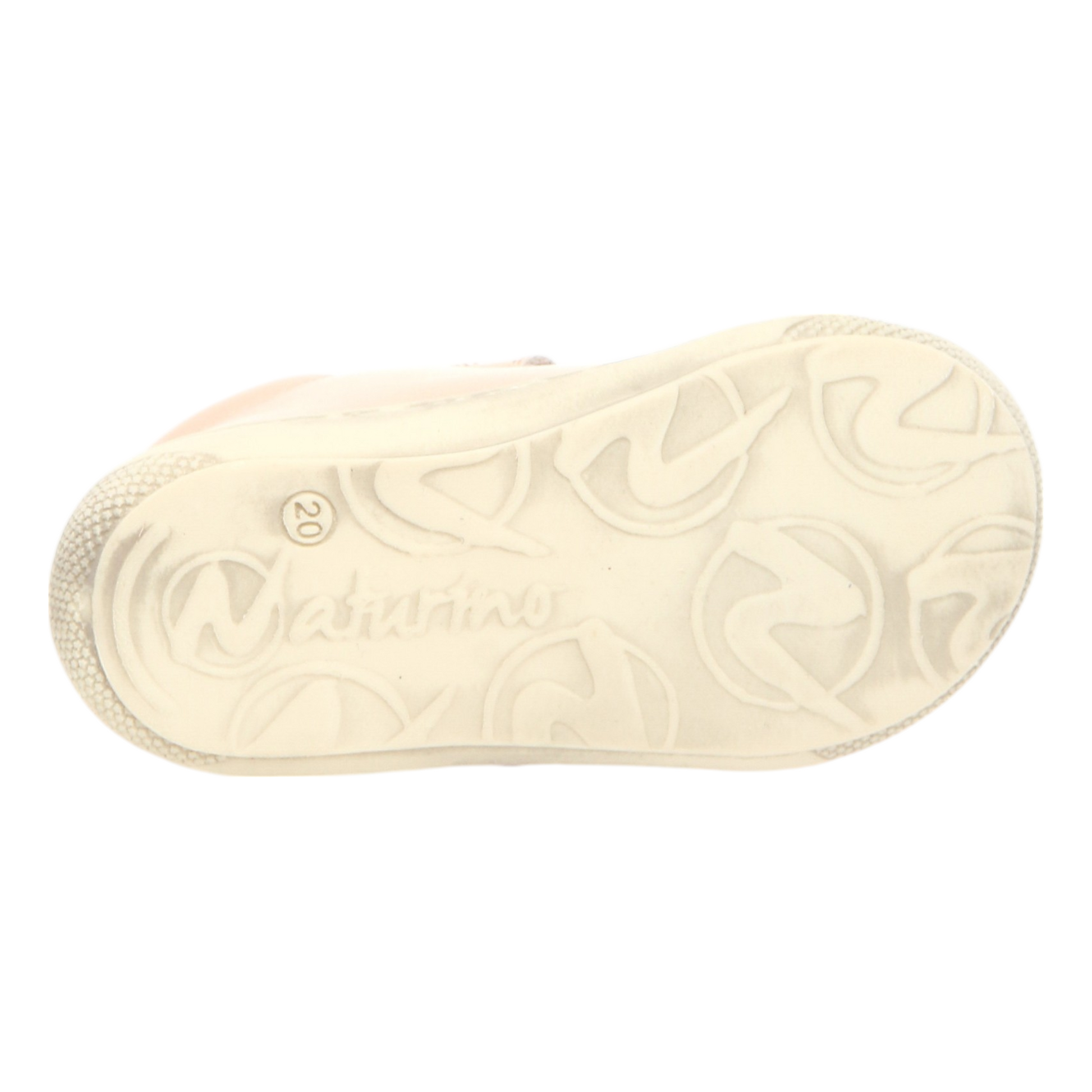 First steps shoes with soft leather upper, contrasting suede toe and large star-shaped side patch. The ankle construction with padding and structured heel offers ideal support for the most inexperienced little feet. Strap closure, leather insole and non-slip rubber sole, with reinforced toe for ground movements.