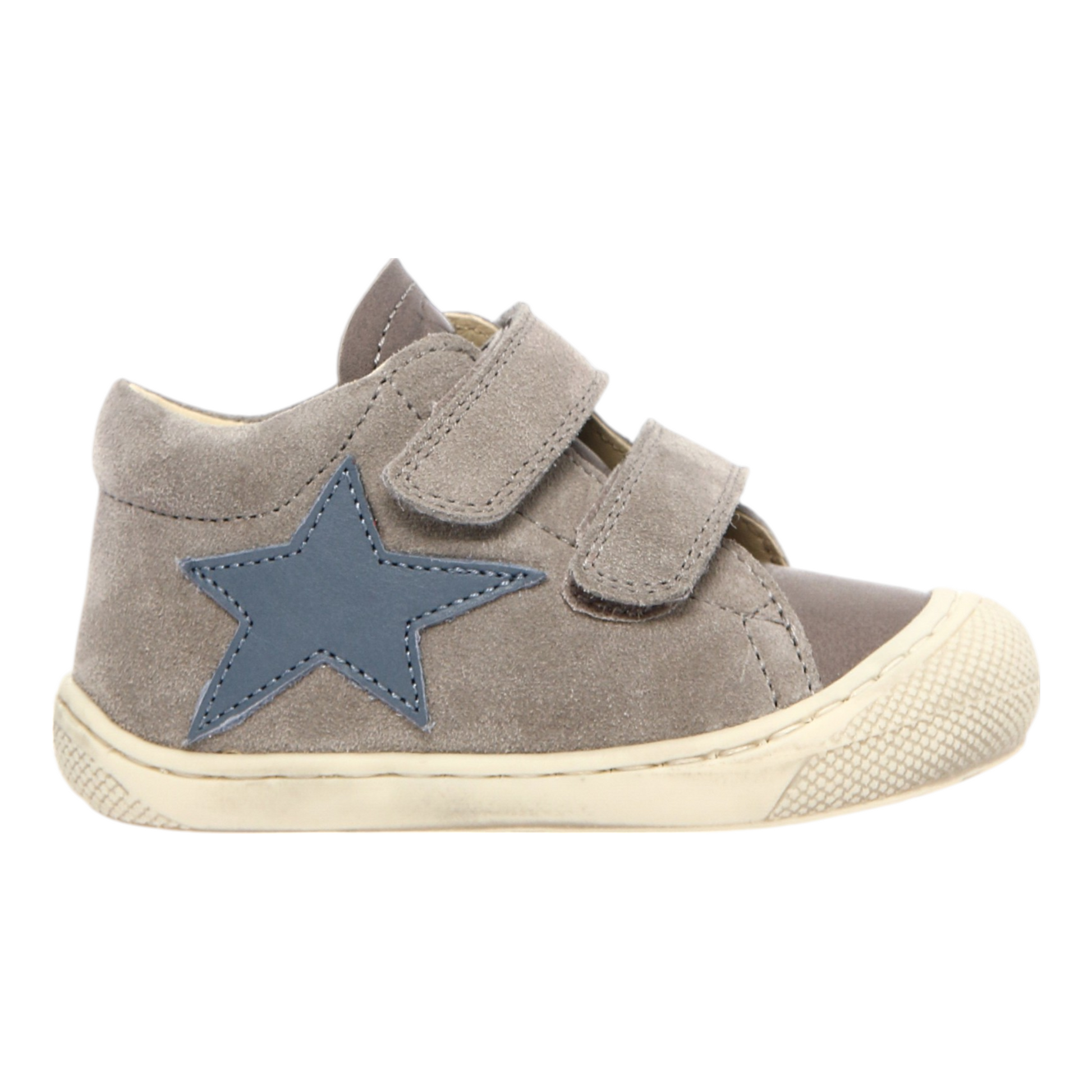 First steps shoes with soft leather upper, contrasting suede toe and large star-shaped side patch. The ankle construction with padding and structured heel offers ideal support for the most inexperienced little feet. Strap closure, leather insole and non-slip rubber sole, with reinforced toe for ground movements.