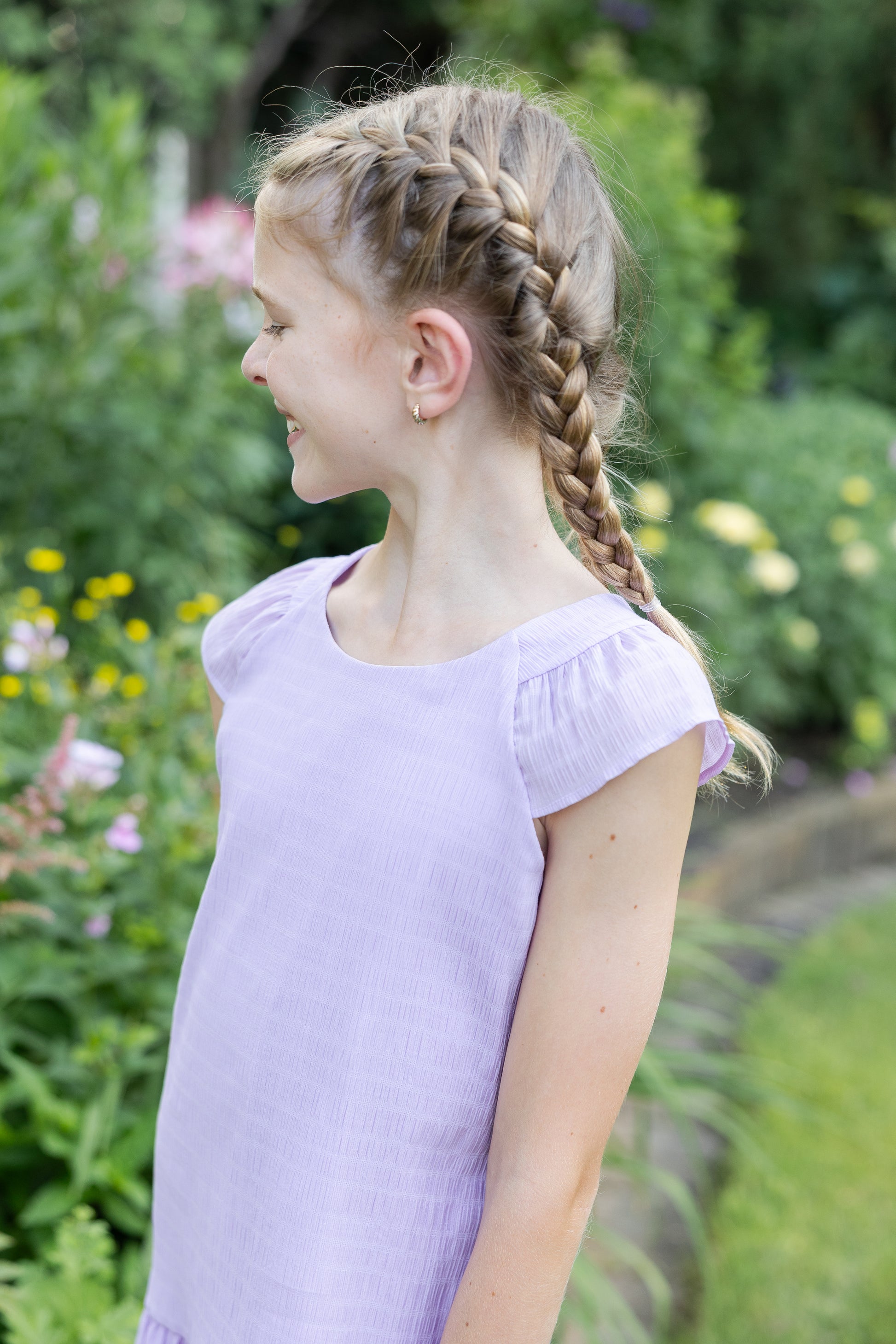 Effortless and airy, this dress is crafted from light purple crinkle lawn with a soft drape and gentle stretch—perfect for warm-weather days away. A shirred hem ruffle adds playful movement, giving the simple silhouette a touch of charm.