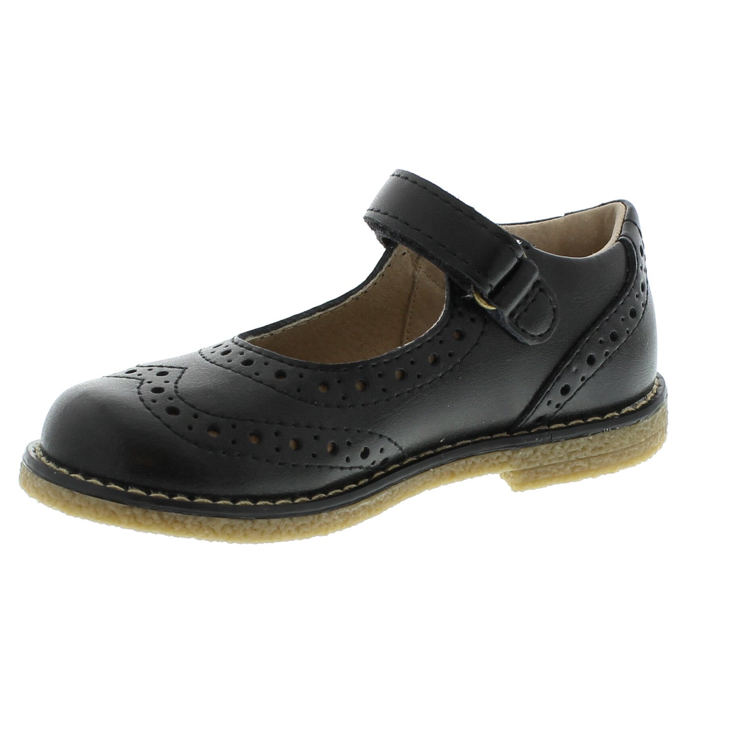 This leather mary jane features a hook-and-loop ankle strap with decorative brogue perf design on vamp, throat, and heel. The Lydia will go perfectly with your child's casual or dressy attire whether it's for church, school, a school program or seasonal pictures.