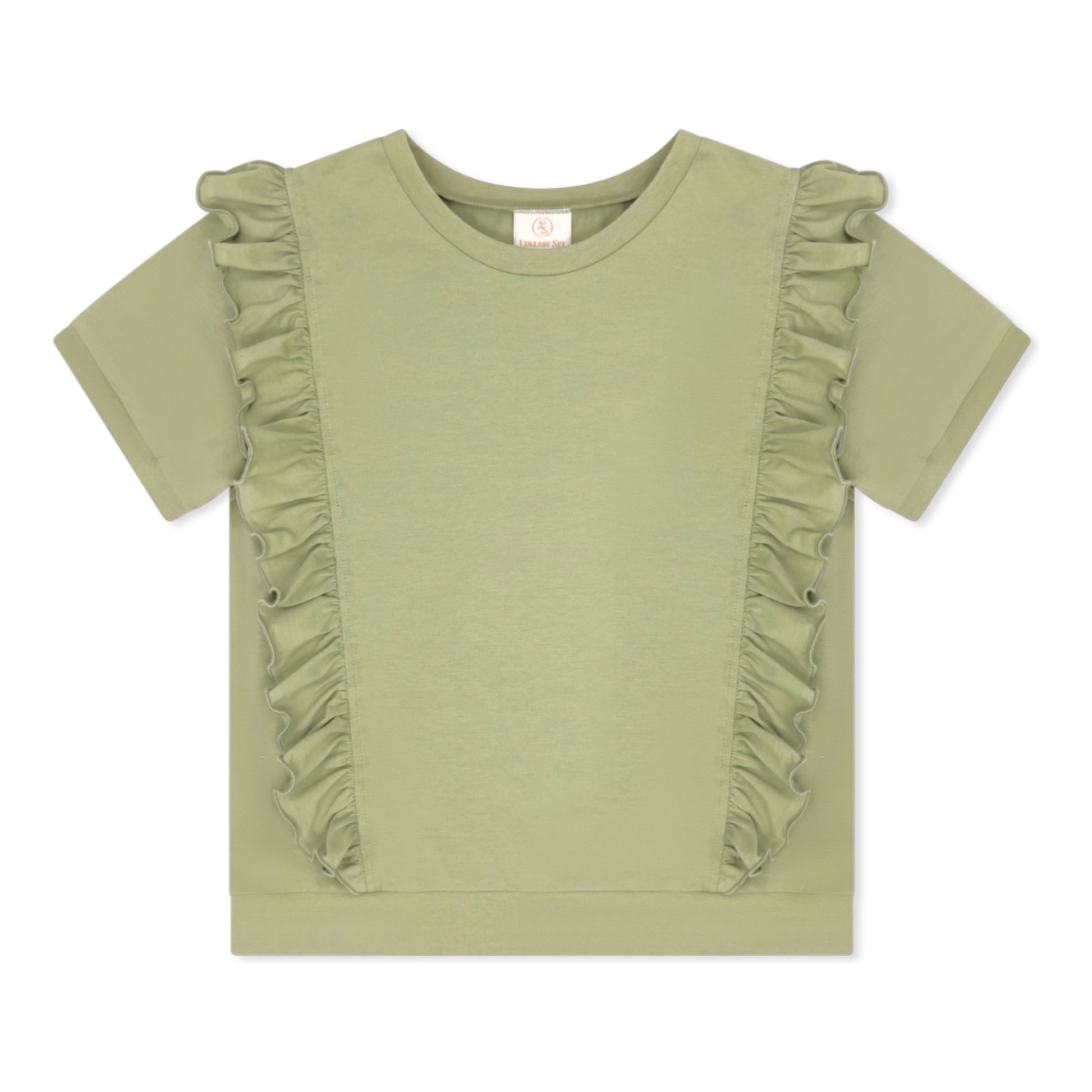 The Magnolia Top in Saybrook Sage Knit is the perfect spring time top. Made from soft jogger knit fabric, this top offers a cozy yet polished look. The ruffle front adds a playful, feminine touch, while the banded bottom ensures a flattering fit. Effortlessly versatile, the Magnolia Top pairs beautifully with skirts, shorts, or joggers for a chic and comfortable outfit.