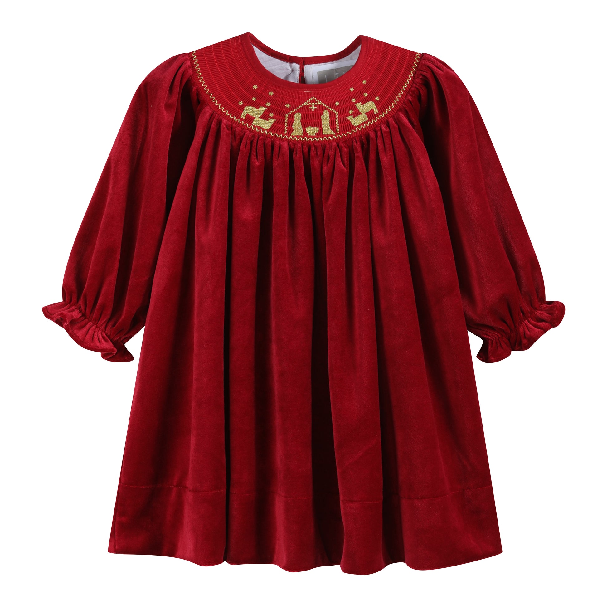 This charming Red Velour Nativity Smocked Dress is guaranteed to infuse your holiday festivities with Christmas joy! Adorned with delightful smocking along the neckline, crafted from a luxurious velour fabric, and embellished with a beautiful gold-embroidered nativity scene, this dress is the perfect choice to make your little girl shine brightly in your family photos.