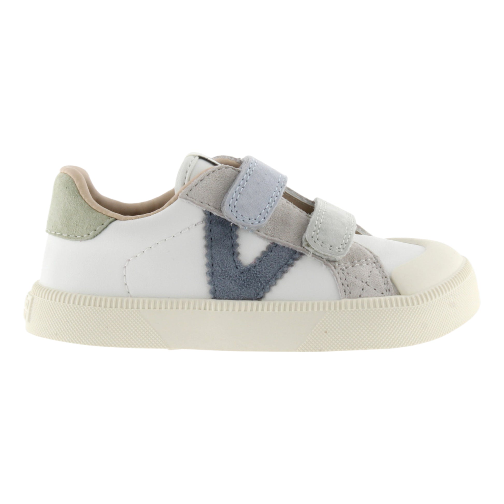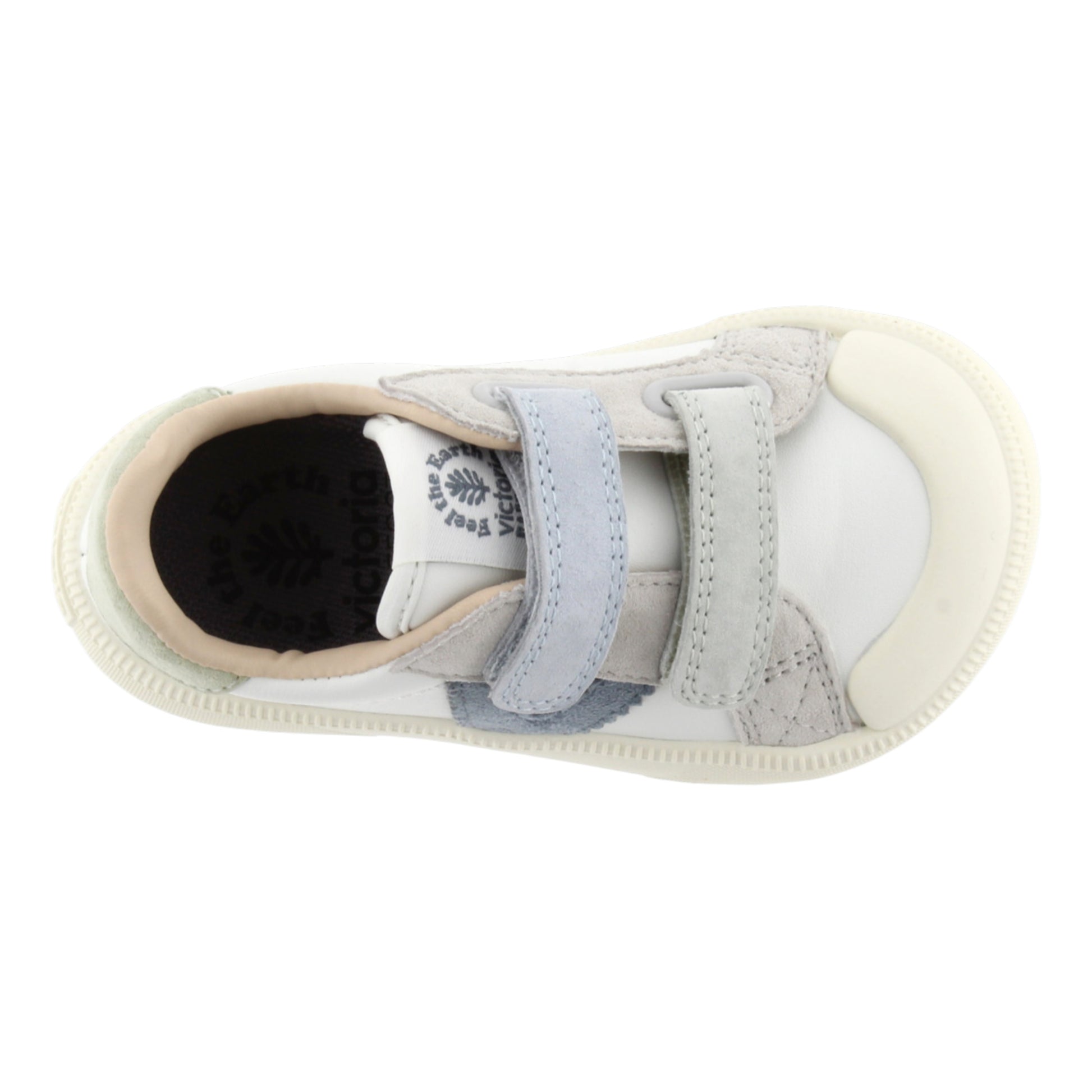 Kids' barefoot trainers made from white faux leather with multicolored suede panels. Hook-and-loop straps (two up to size 35 and three from size 36 onwards) provide extra support and make them easy to put on, encouraging independence. Slightly toasted TPR sole with reinforced toe cap for greater strength and durability.