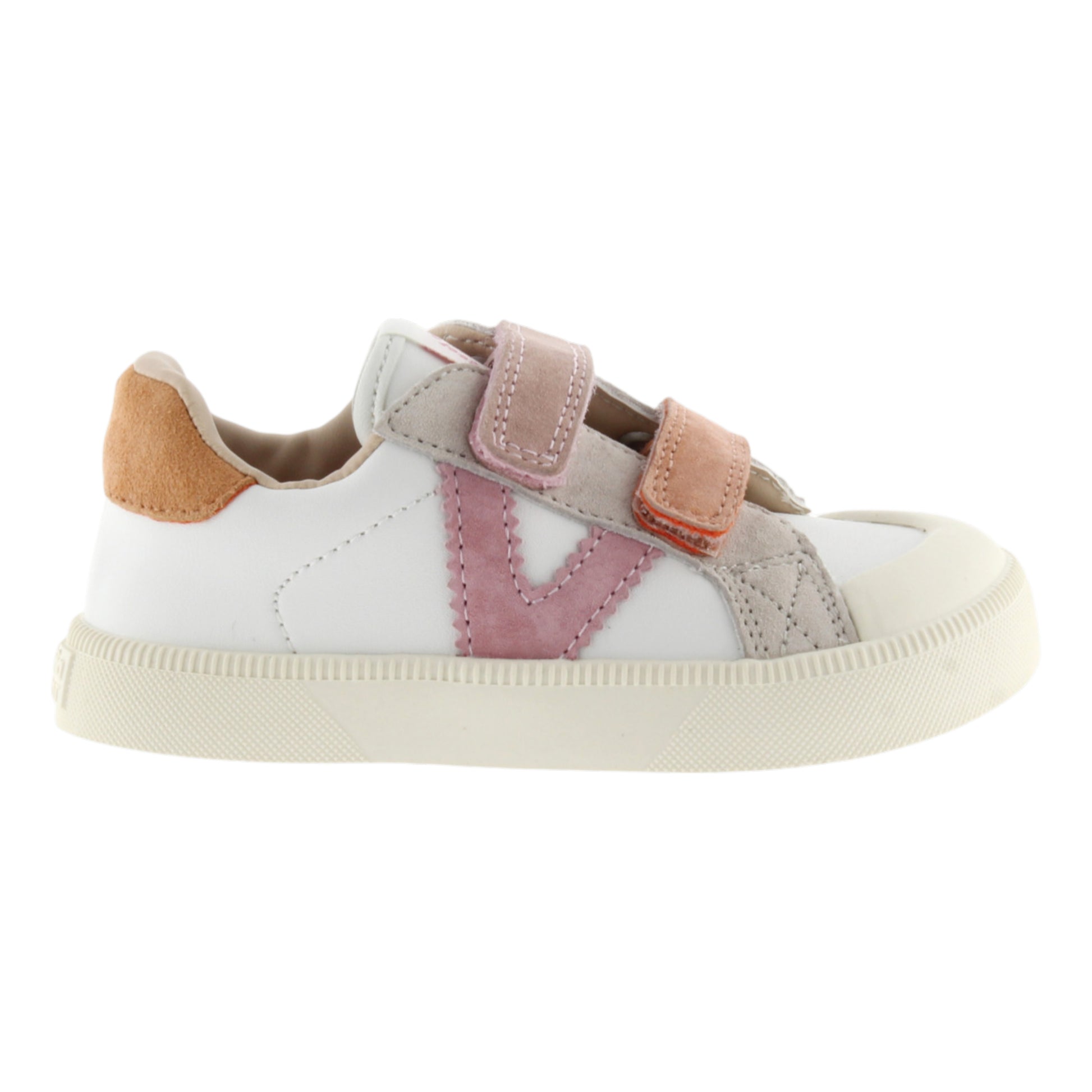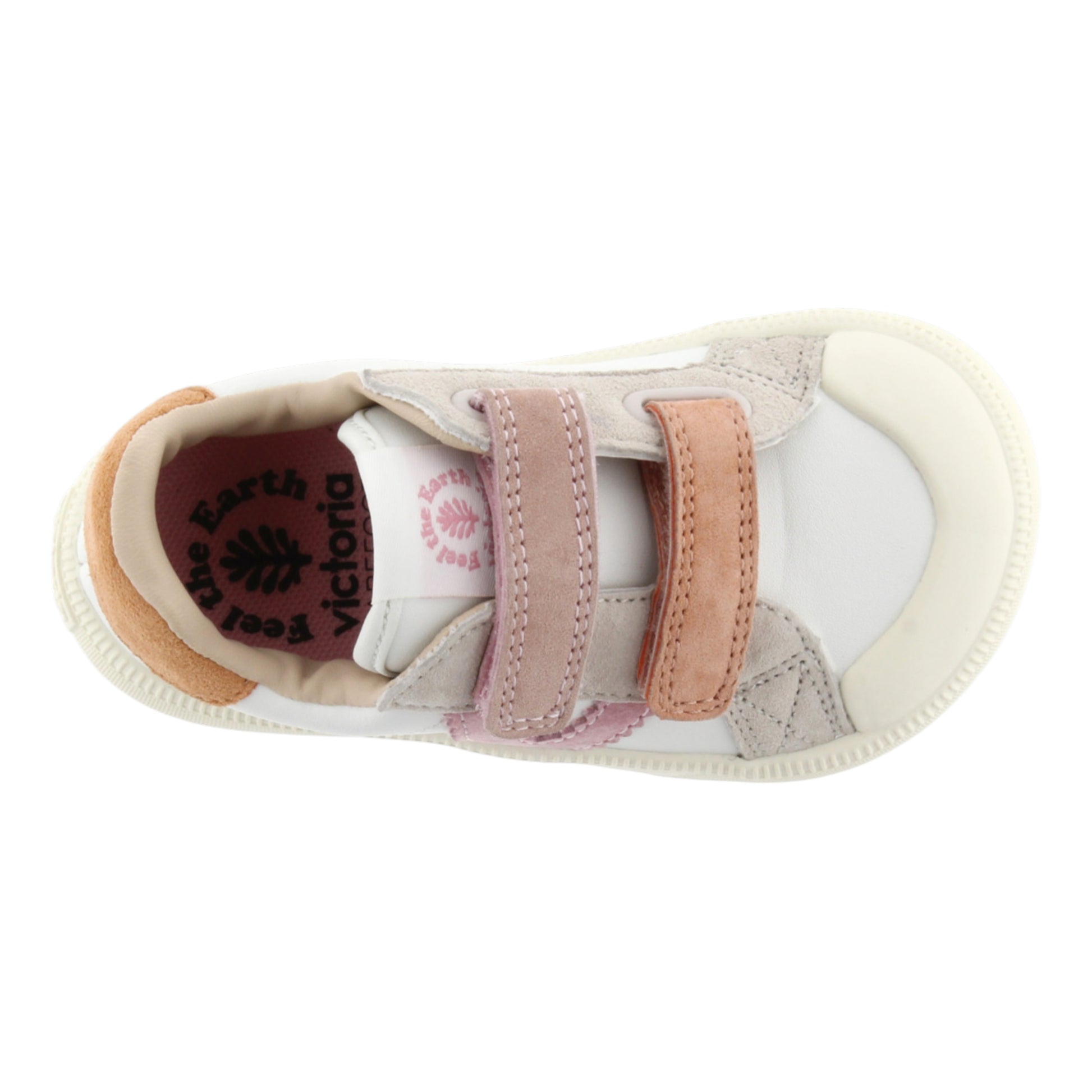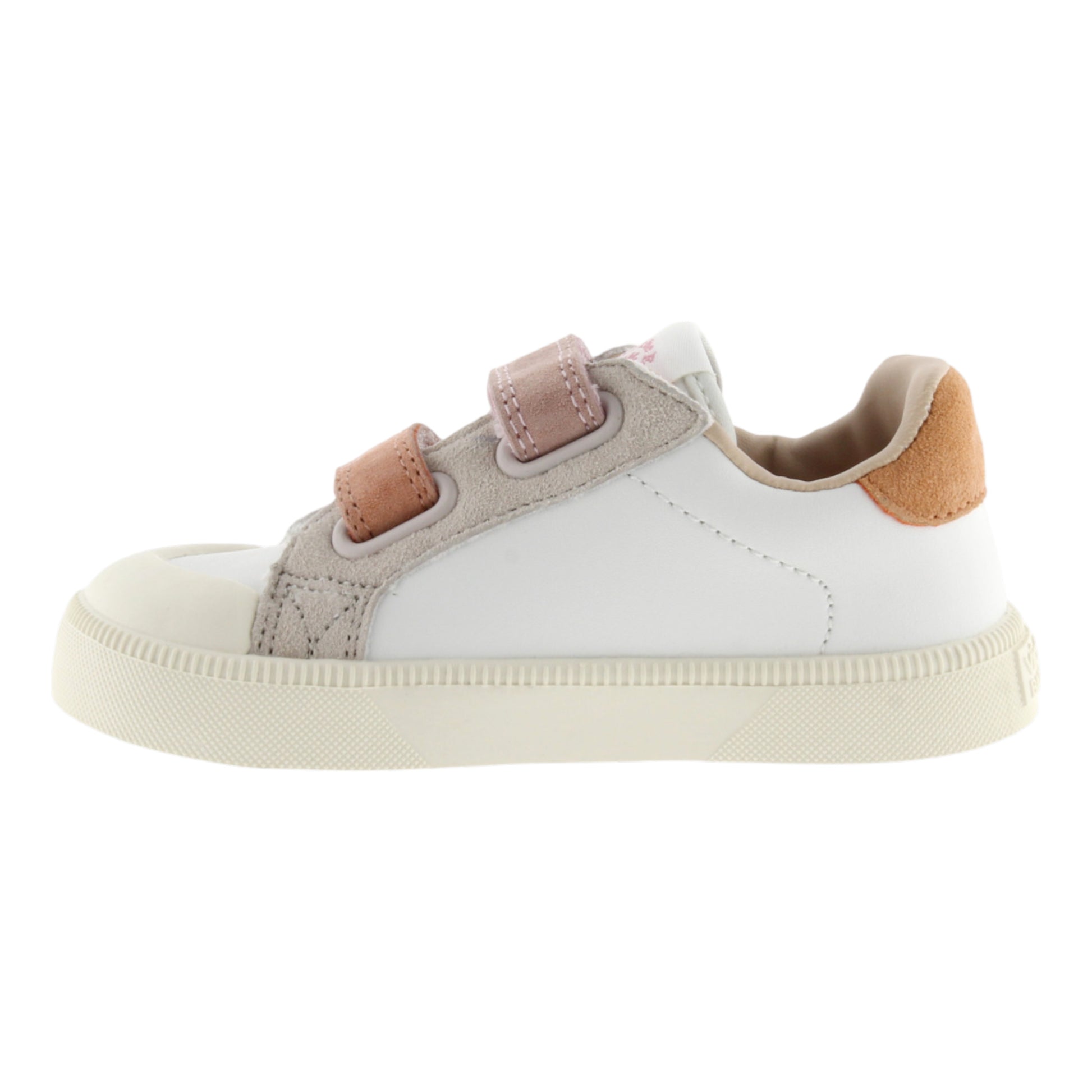 Kids' barefoot trainers made from white faux leather with multicolored suede panels. Hook-and-loop straps (two up to size 35 and three from size 36 onwards) provide extra support and make them easy to put on, encouraging independence. Slightly toasted TPR sole with reinforced toe cap for greater strength and durability.