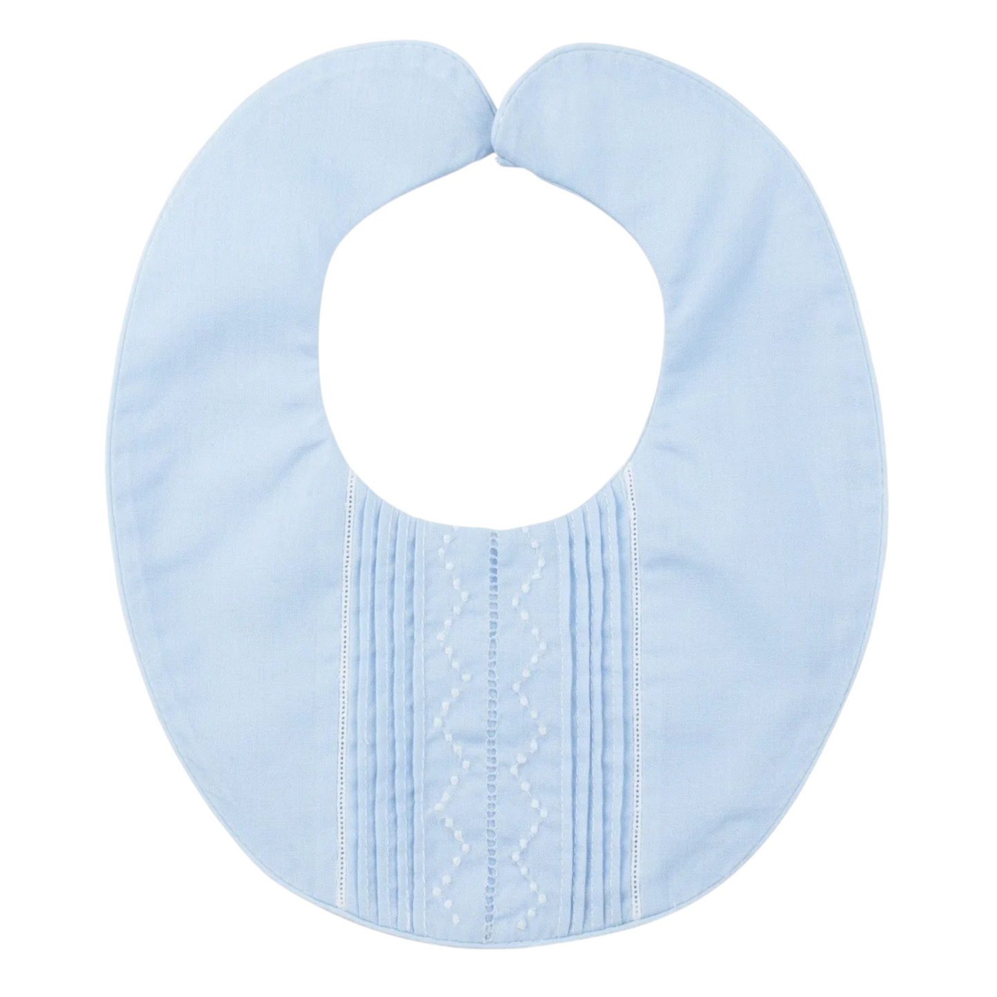 Protect your little one's gown, romper, or bobby suit with a coordinating vintage style bib. This classy baby boy accessory is made with beautiful details down the center - fine pintucks and beading lace beside intricate hand embroidery and a central row of boring. With a bib so elegant, you won't want your prince to get dirty at all...