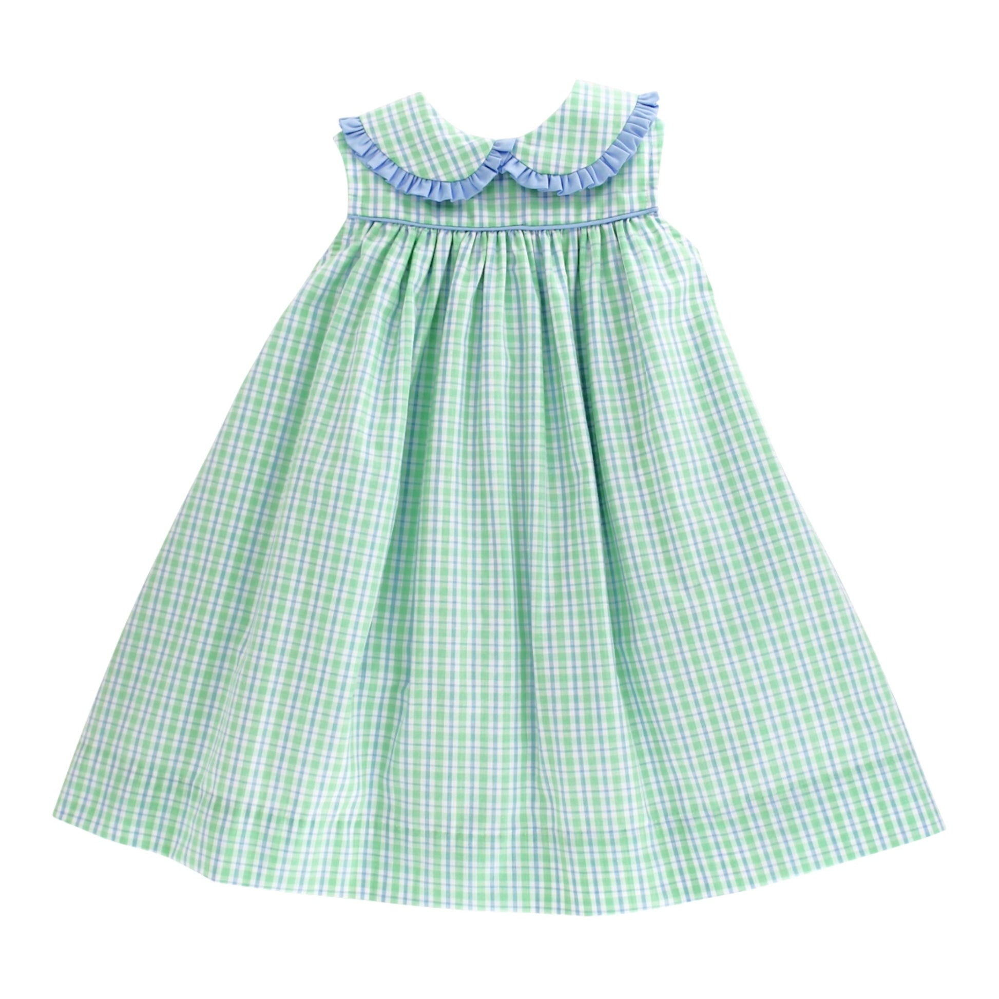 The Bridgewater Plaid Dress pairs timeless color with refined design. Its soft blue-and-green plaid and full skirt create movement and charm. The cotton fabric’s texture adds quiet dimension, making it both everyday-easy and portrait-perfect. A lasting favorite for spring.