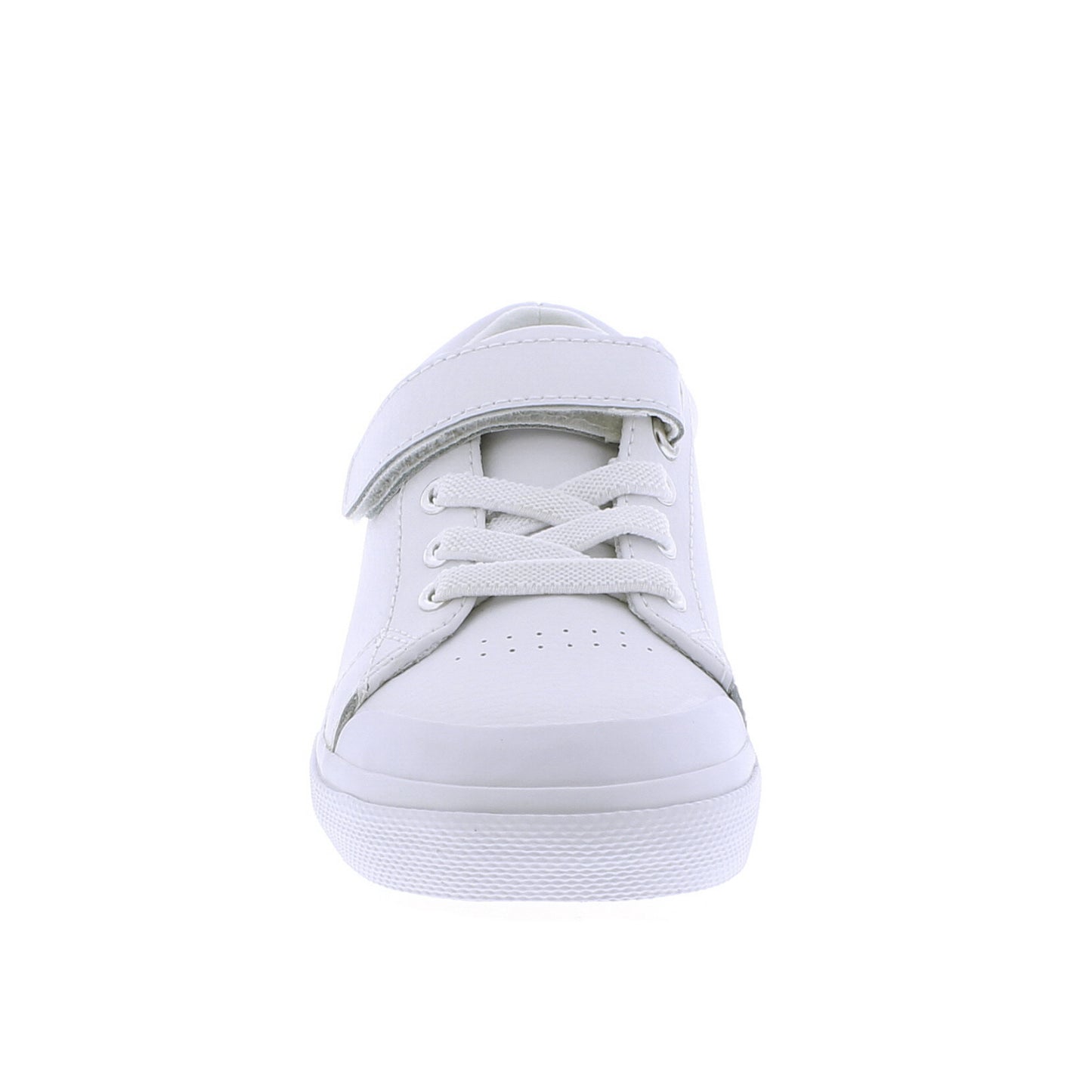 These leather blucher oxford vulcanized sneaker features a hook-and-loop closure and decorative elasticized false- laces.