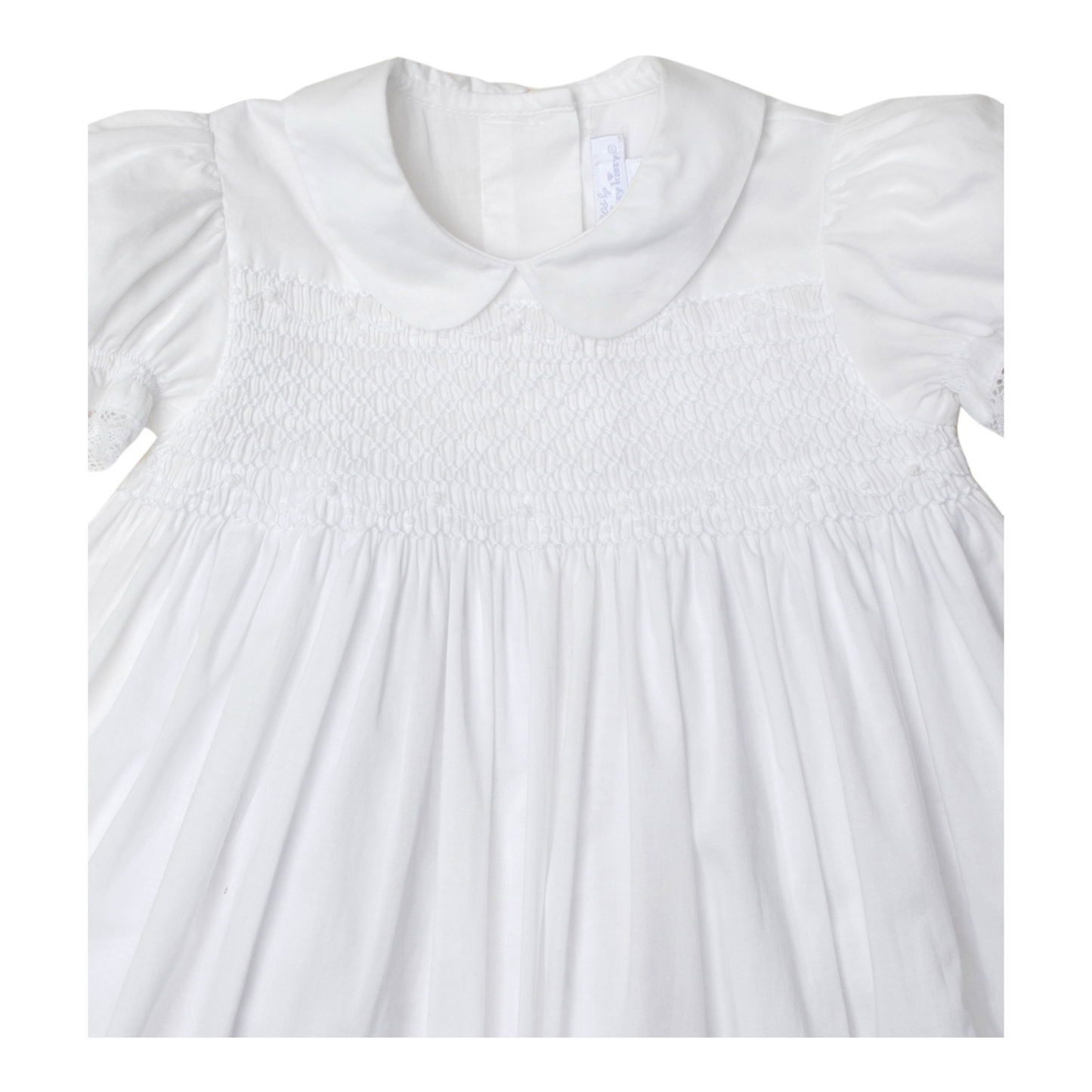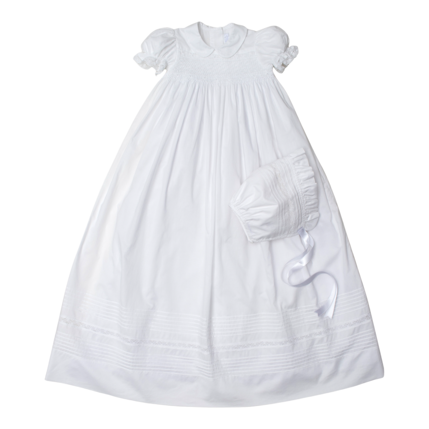 - Gentle smocking releases the ample skirt of the beautiful Silene gown detailed with dainty embroidery and lace-traced puff sleeves. A keepsake bonnet provides a sweet, photo-ready finish.