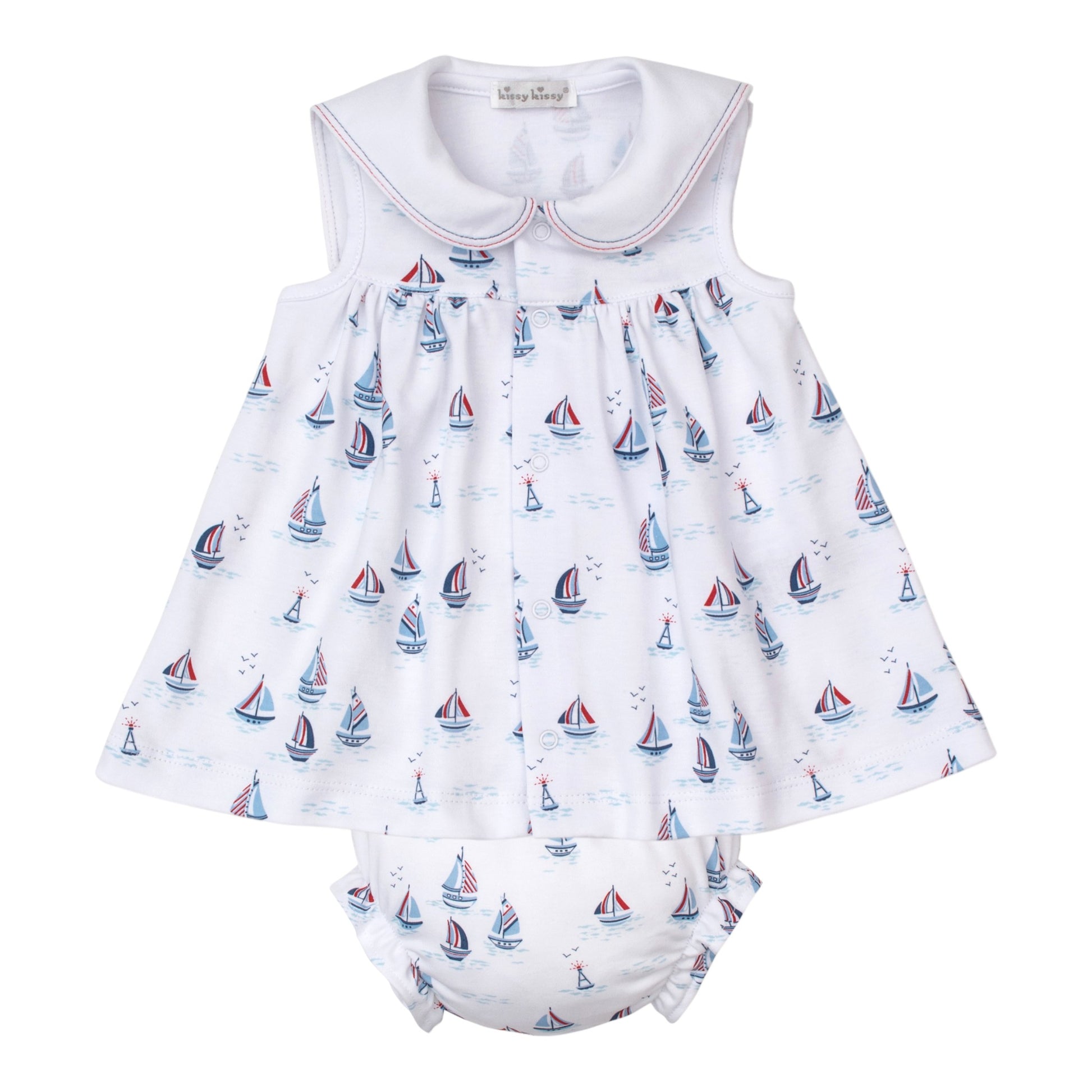 Our fun red, white, & blue regatta print patterns this baby girls' dress set, complete with a diaper cover. Made from 100% Pima cotton for a soft and comfortable fit.