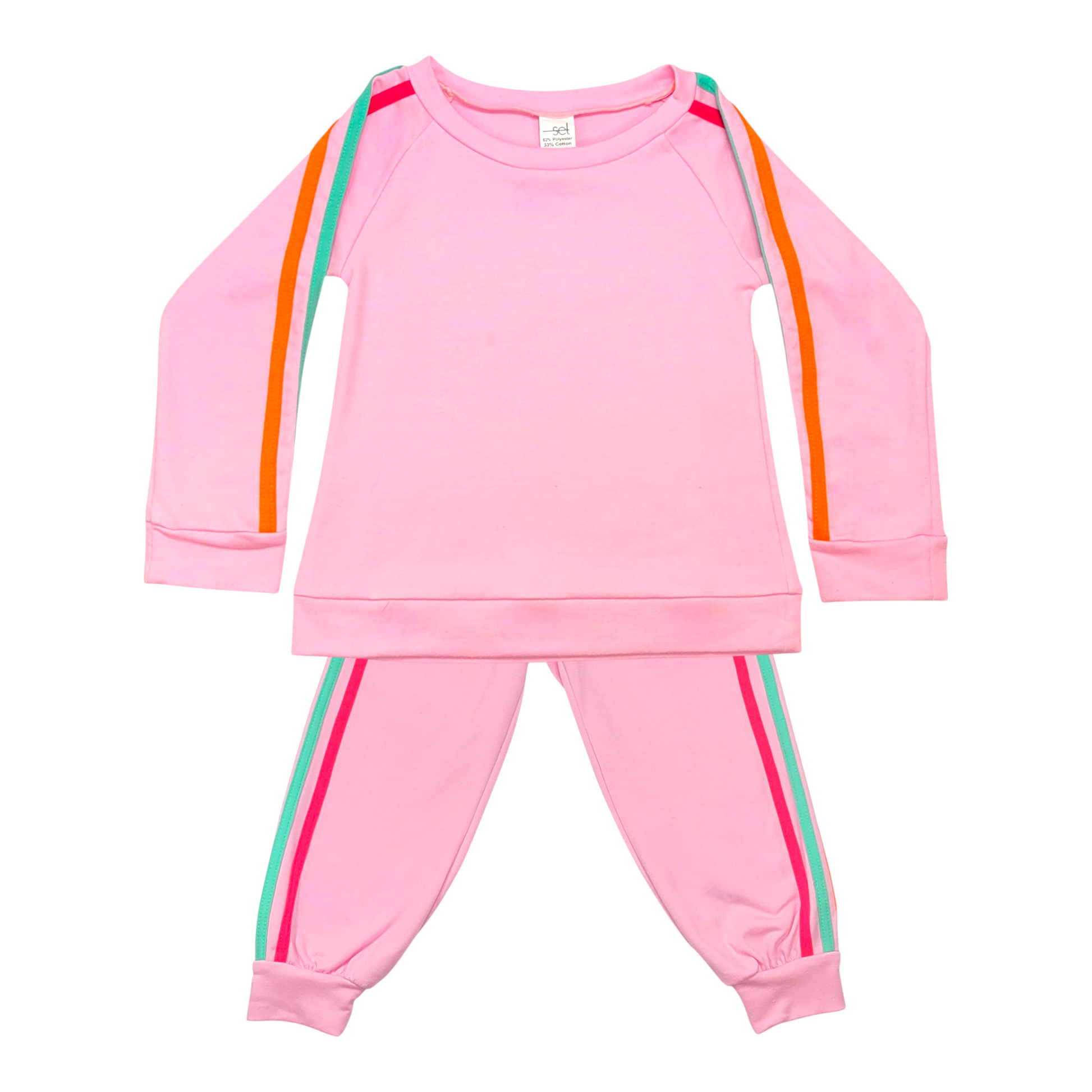 The Savannah Jogger Set is the perfect addition to any girls wardrobe. This knit set in Taffy Pink with fun stripe detail down the arms and legs will have her feeling hip and comfy all winter long.