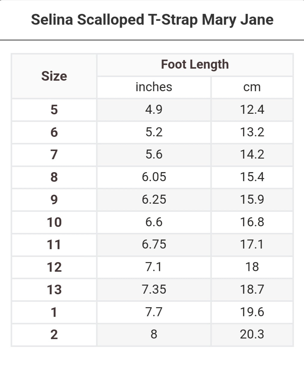 Selina is what we call an irresistibly pretty shoe. The scalloped detail on the t-strap is hard to miss. She's one of our favorites for a adding a touch of pretty to any outfit.