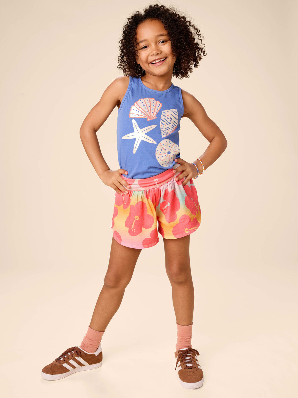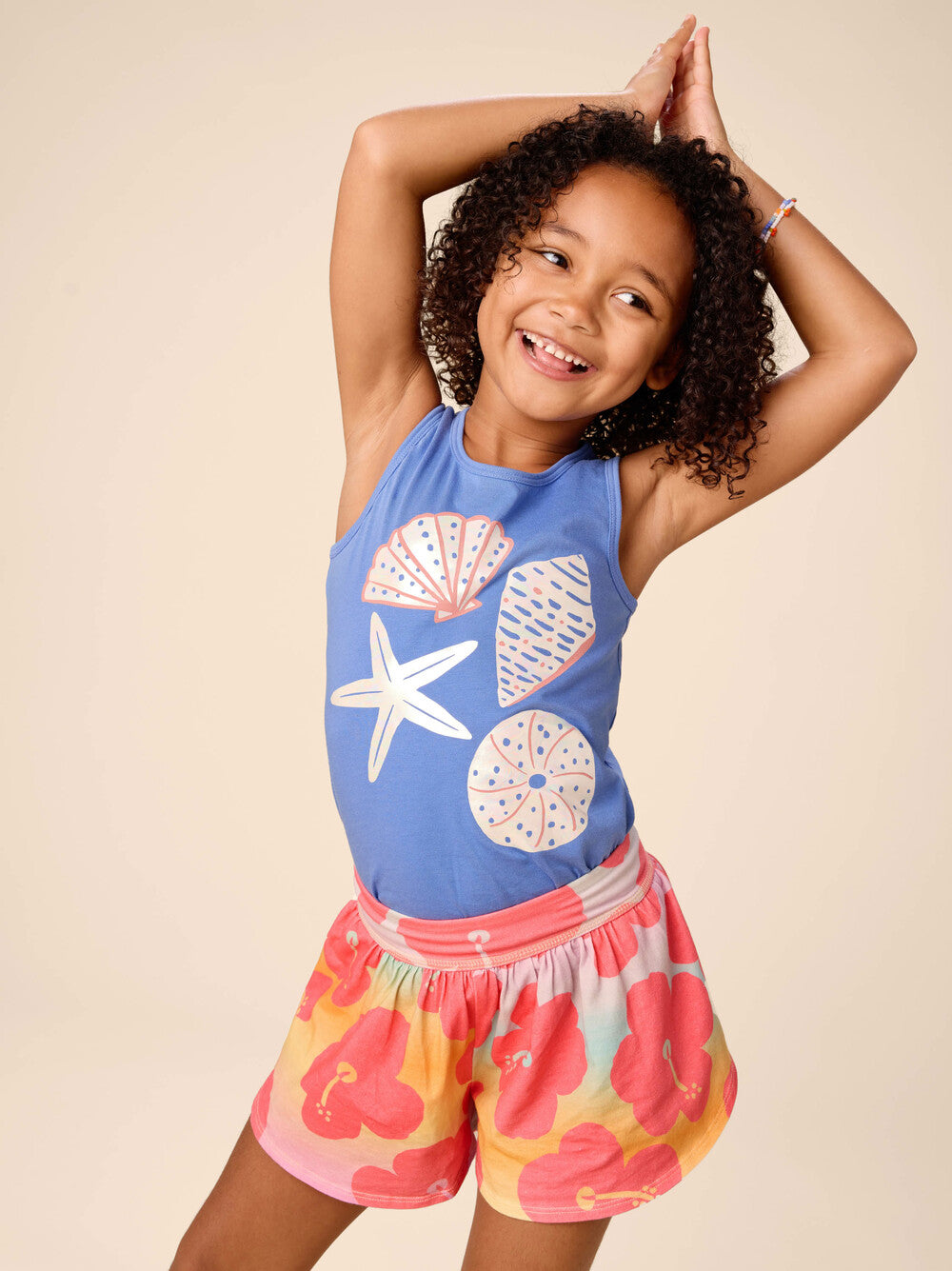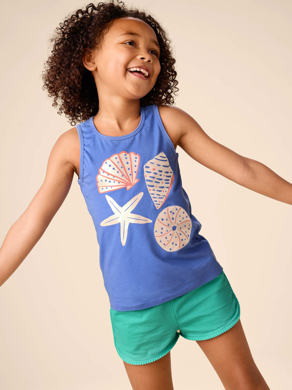 Beach day ready! This breezy tank features a collection of sea treasures--starfish, sand dollars, and shells--with a special shimmery finish that catches the light just like the real thing. Made for sunny adventures and crafted from 100% soft cotton jersey. Pairs perfectly with pom-pom shorts or a skort. Above thigh length.