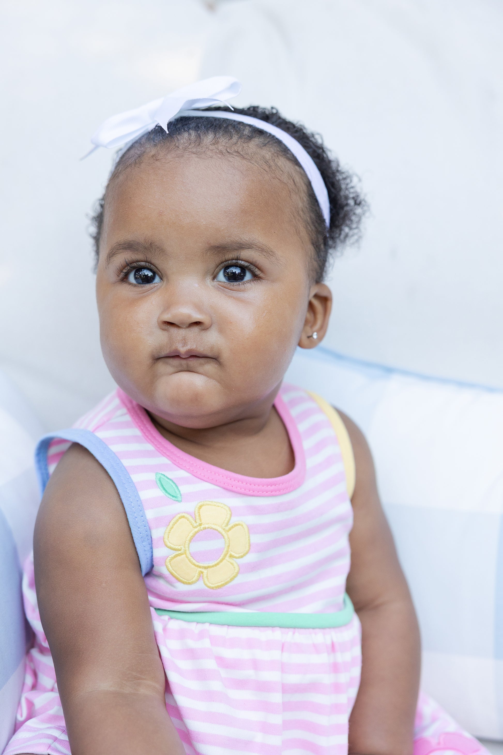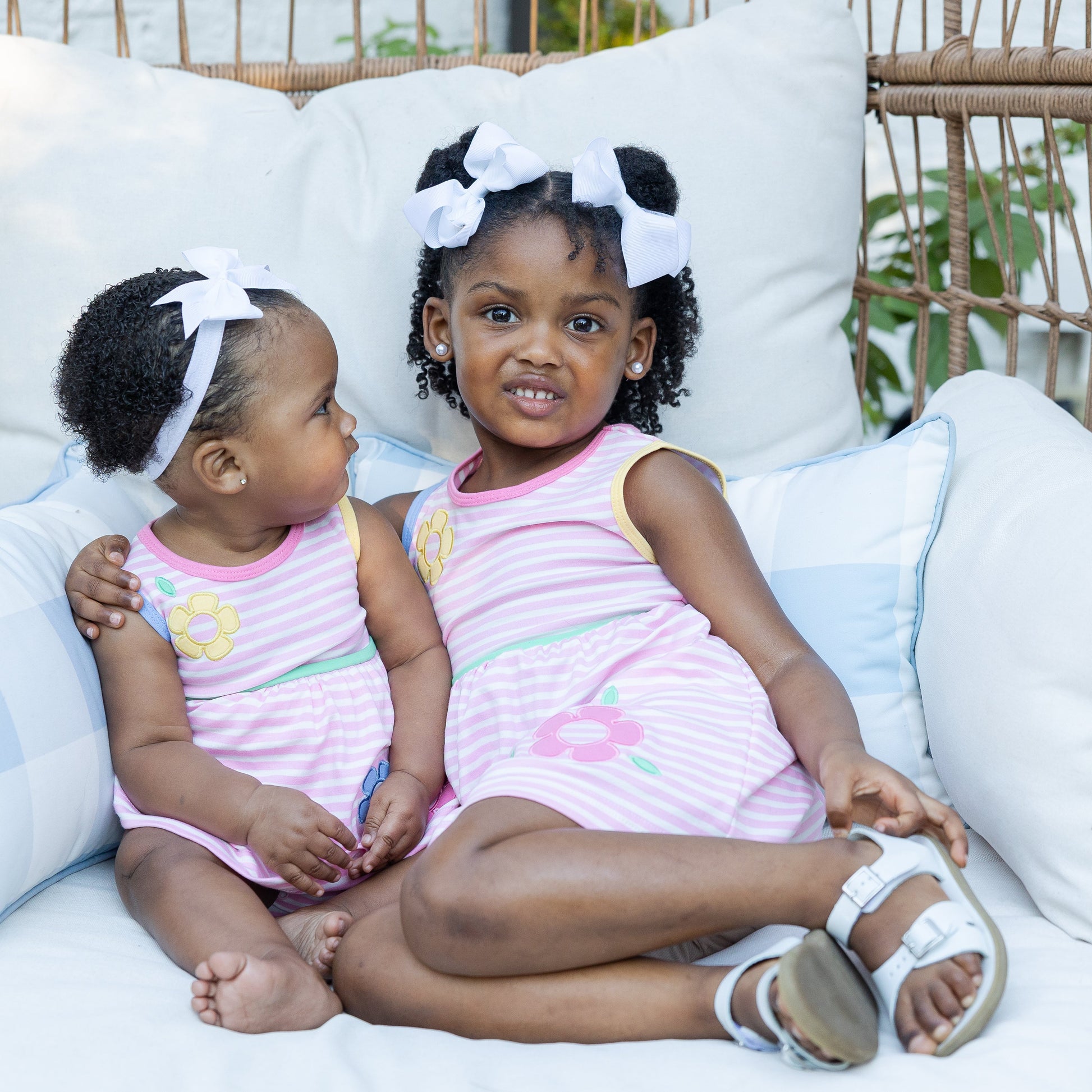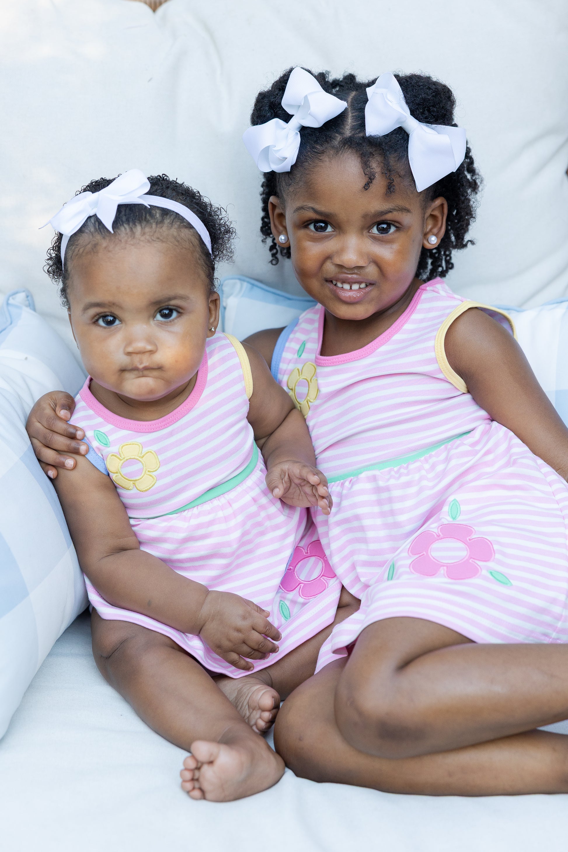 Bright, sweet, and ready for sunny play, this romper is crafted from pink and white yarn-dyed stripe interlock knit for soft, all-day comfort. Pink, blue, and yellow appliqué flowers bloom across the front, while multicolor trim at the neck, armholes, and waist adds a cheerful pop of color.