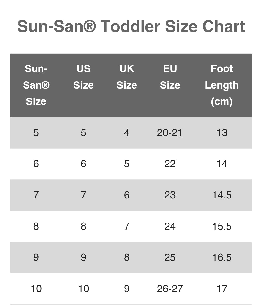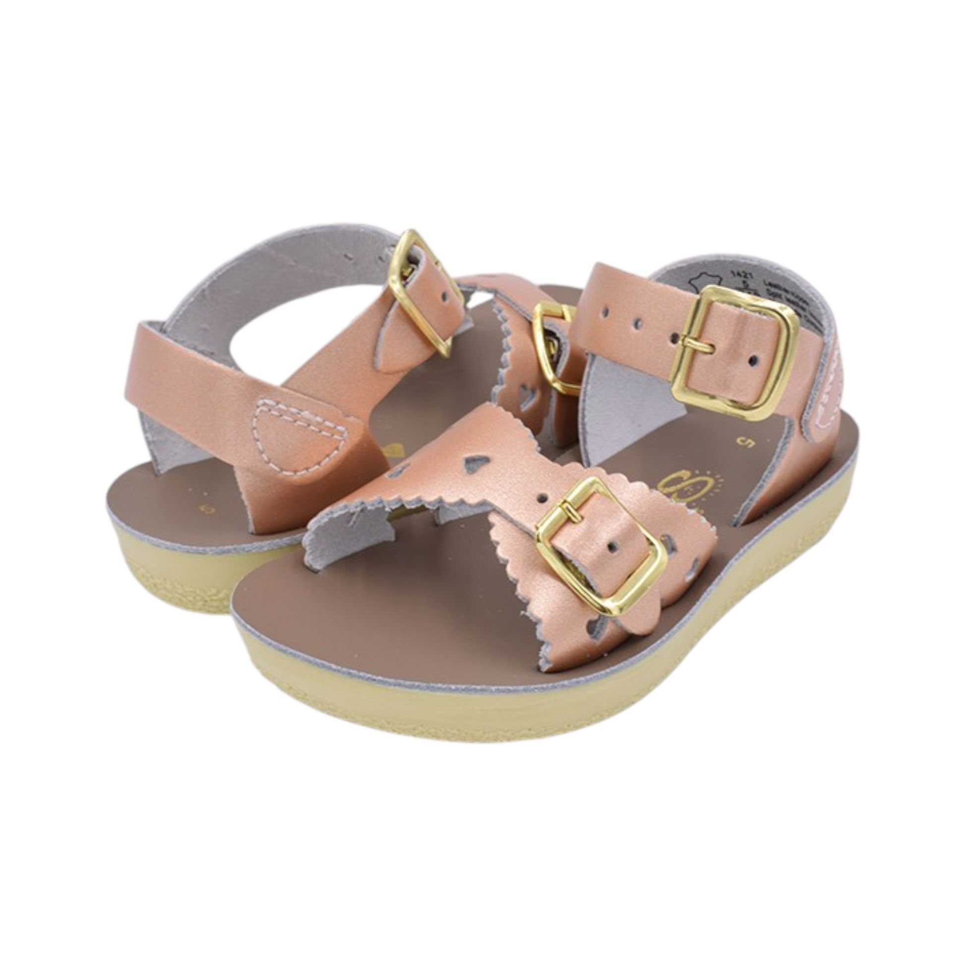 The Sun-San Sweetheart is a pretty sandal with heart-shape cutouts and scalloped edges. It’s fully adjustable with a buckled toe and ankle straps. As seen on many celebrities’ kids, the Sweetheart is a popular choice. The combination of comfort, durability and fashion make these a wear-anywhere sandal.
