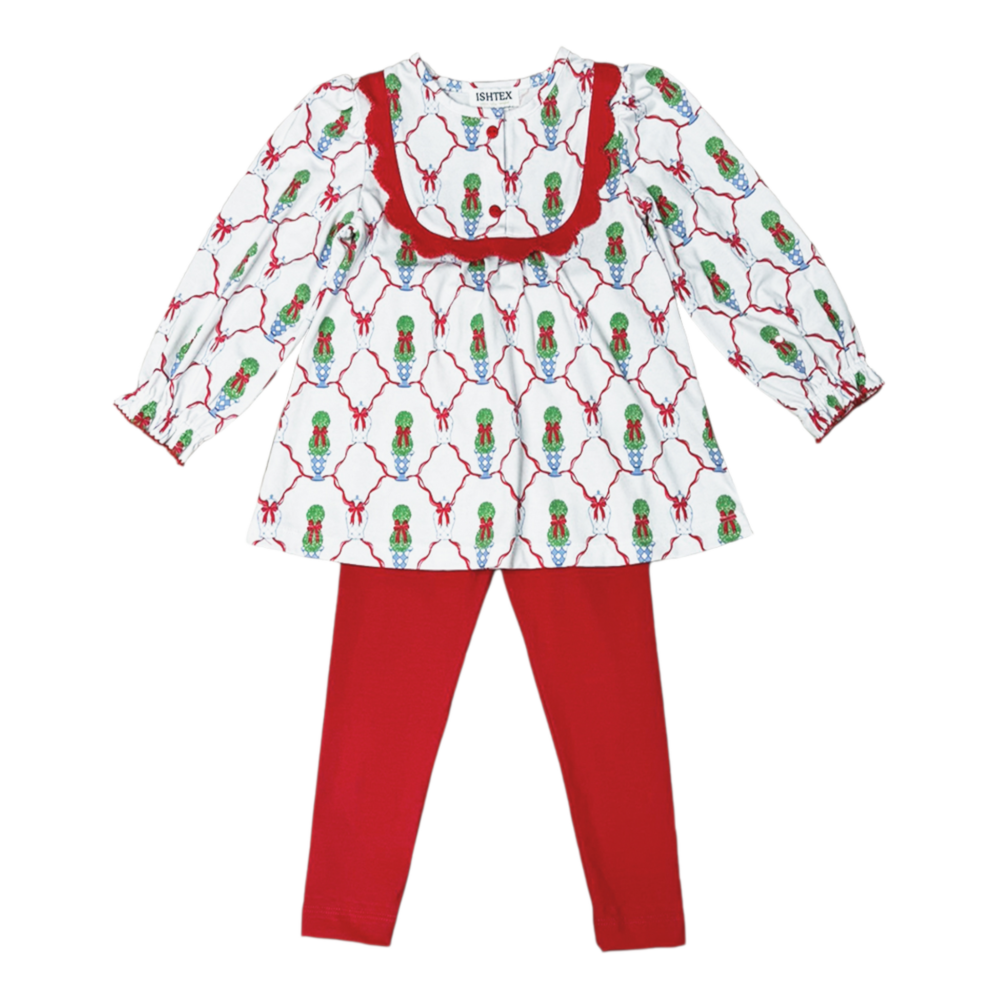 Delight in the timeless elegance of this holiday topiary legging set from Ishtex Textile Products' Fall/Winter 2025 collection. This set is beautifully crafted for little girls, offering a blend of style and comfort that is perfect for any occasion from casual outings to special events.