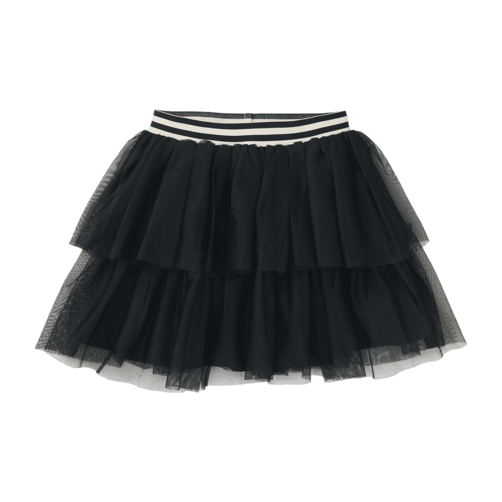 A fresh spin on a classic favorite, this tiered tulle skirt is all about movement and fun. With its layered mesh overlay and striped elastic waistband, it brings just the right mix of whimsy and sporty flair. The soft jersey lining ensures comfort while the voluminous silhouette inspires endless twirls. Perfect for dressing up or down, it pairs effortlessly with graphic tees or dressy tops alike.