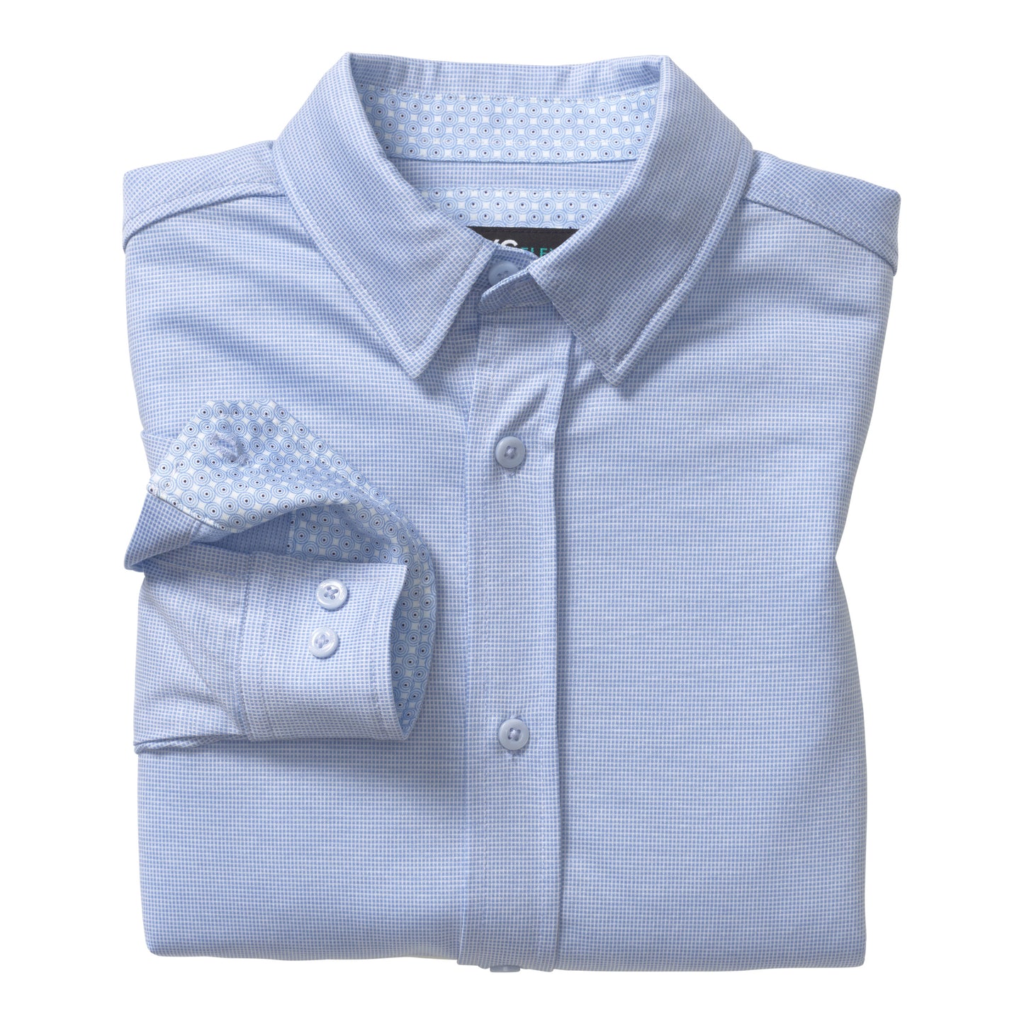 A stretchy approach to the classic button-front shirt in fun prints and one solid.